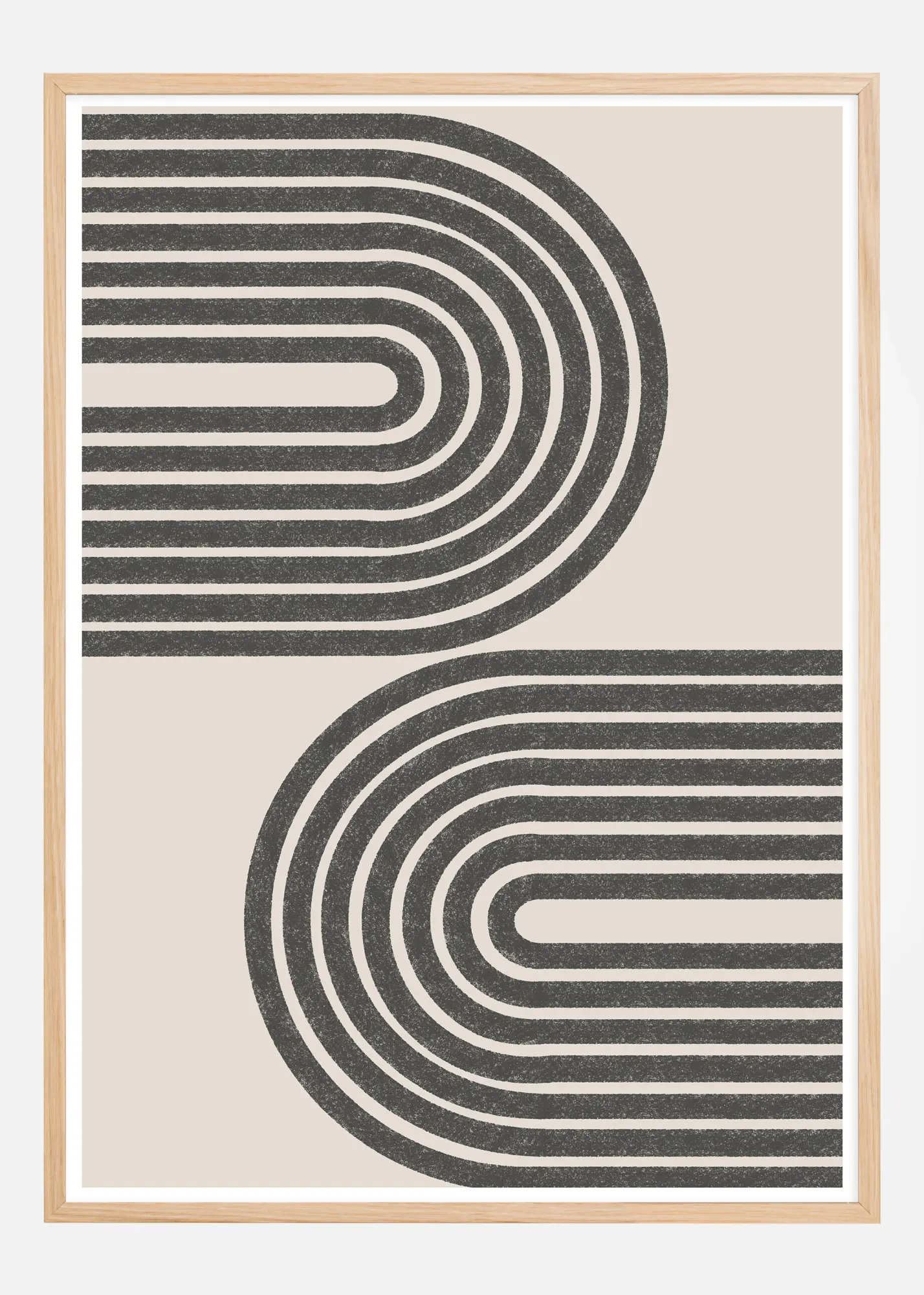 Ce poster élégant et contemporain se distingue par sa composition dynamique de formes concentriques doubles qui se fondent dans une danse élégante. Le design équilibre mouvement et quiétude, avec des lignes noires qui ondulent harmonieusement sur un fond chaud et neutre. La structure ludique mais ordonnée en noir et ivoire est un excellent ajout pour le client soucieux du design à la recherche d'une impression accrocheuse pour rehausser son espace domestique ou de bureau.