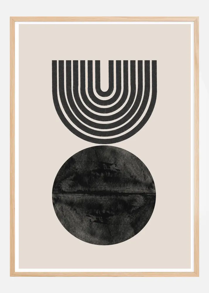 Cet affiche artistique capte l'œil par son contraste audacieux et sa composition fascinante de formes géométriques et organiques. En haut, une série de lignes noires crée une demi-cercle, offrant une structure visuelle forte contre le fond calme et neutre. En dessous, nous voyons un cercle noir texturé rappelant les reflets dans l'eau, ajoutant une qualité profonde et mystique au design. Les couleurs choisies en noir et blanc cassé créent une palette intemporelle qui séduit une variété de goûts et de styles d'intérieur.