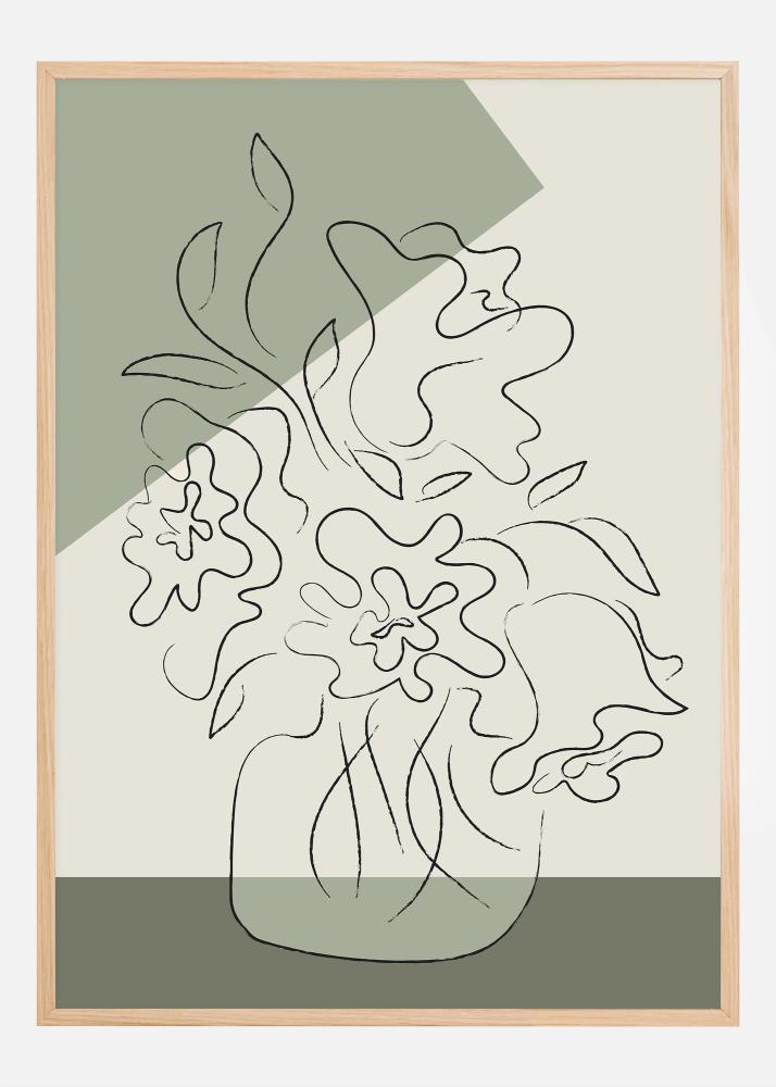 Ce poster artistique abstrait représente des pétales de fleurs et un feuillage stylisés dans un dessin au trait fluide et élégant, flottant sur un fond bicolore de tons verts doux et neutres. La beauté simple du design, renforcée par une légère texture qui apporte une sensation organique, crée une atmosphère détendue et calme. Cet imprimé moderne et élégant s’intégrerait parfaitement dans une maison inspirée du minimalisme ou du style scandinave, apportant une touche de calme naturel sans envahir la pièce avec trop de couleur ou de complexité.