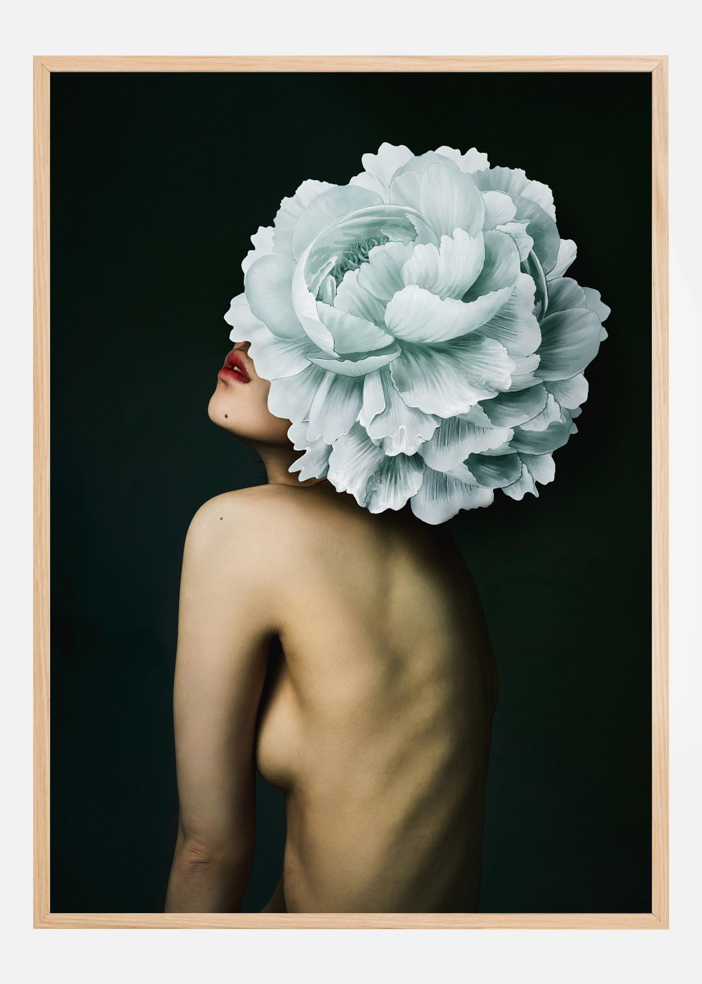 Cette affiche présente une composition fascinante et artistique où la beauté humaine rencontre les merveilles de la nature. L'image montre une personne vue de dos, la tête remplacée par une fleur grandiose, presque surdimensionnée, en blanc. Le contraste entre la peau douce et la fleur détaillée crée une symbiose visuelle à la fois onirique et suggestive. Le schéma de couleur de l'impression est simple mais puissant, avec des nuances de blanc, de teinte chair et le rouge profond des lèvres, sur un fond sombre, presque monochrome.