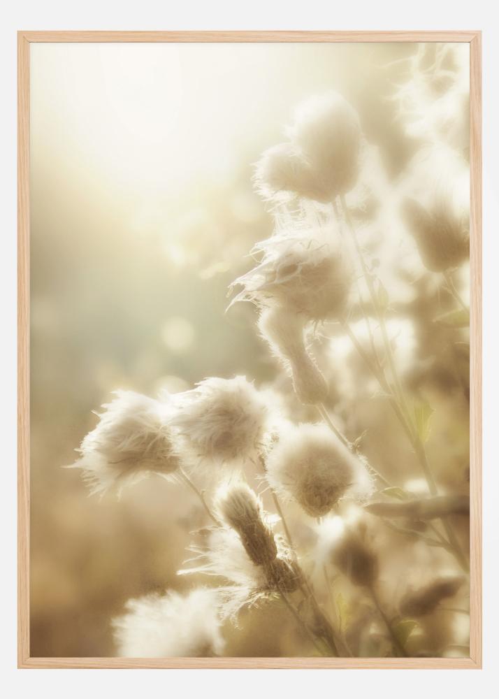 Une affiche magique de fleurs duveteuses dans une lueur matinale. Les boules douces des fleurs sont illuminées par la lumière du matin, créant des halos angéliques autour de chaque fleur. Les doux tons pastel contribuent à créer un sentiment endormi de magie, pour un réveil en douceur.