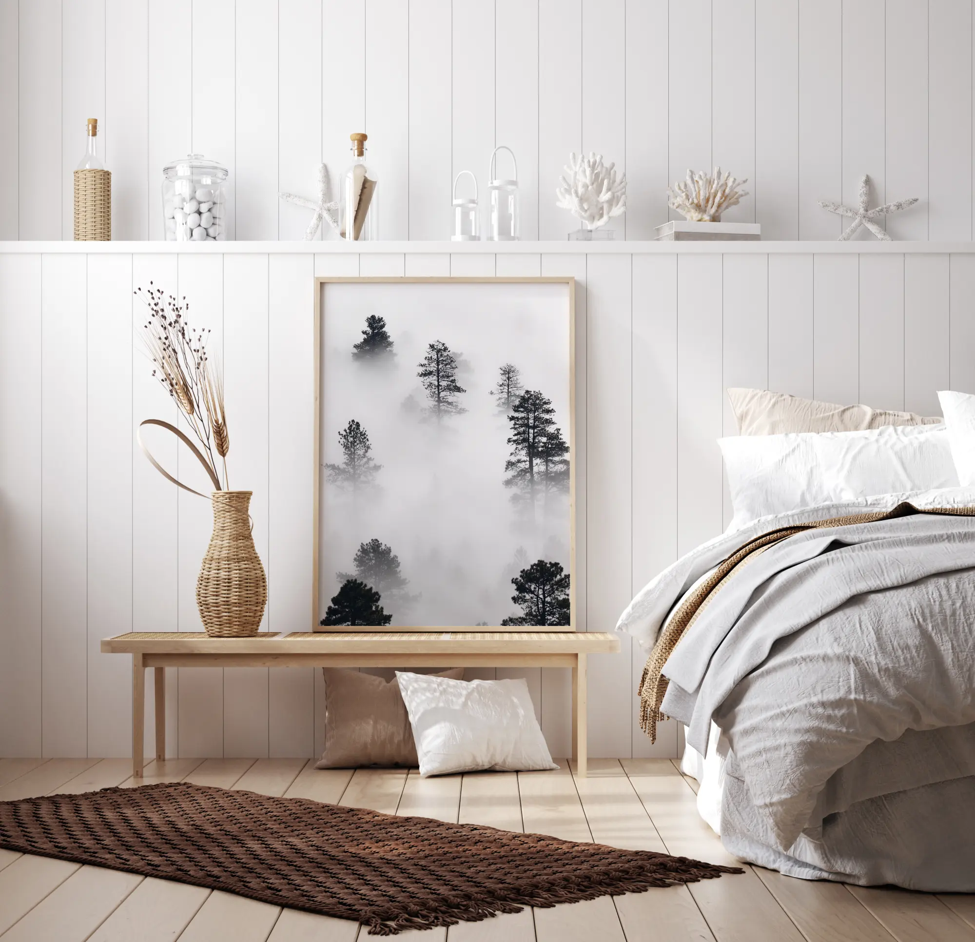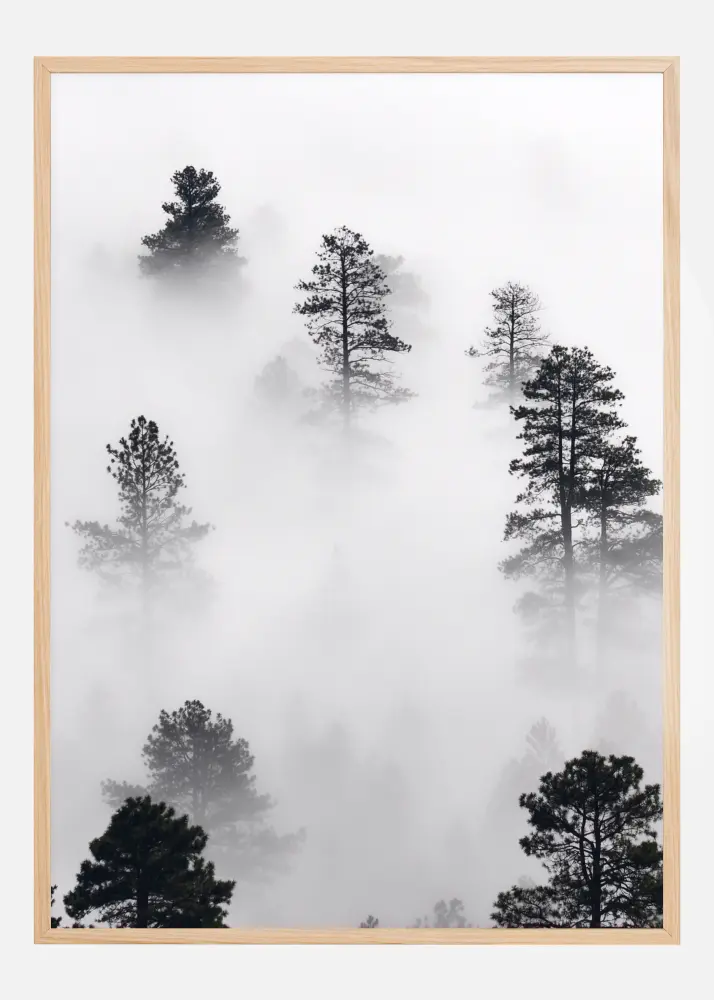 Une affiche de paysage étonnant d'une forêt dans le brouillard. La cime de grands arbres sombres émerge du brouillard blanc pâle pour créer un fort contraste. Apportez cette sensation de fraîcheur hivernale dans votre maison en l'accrochant sur un mur neutre.