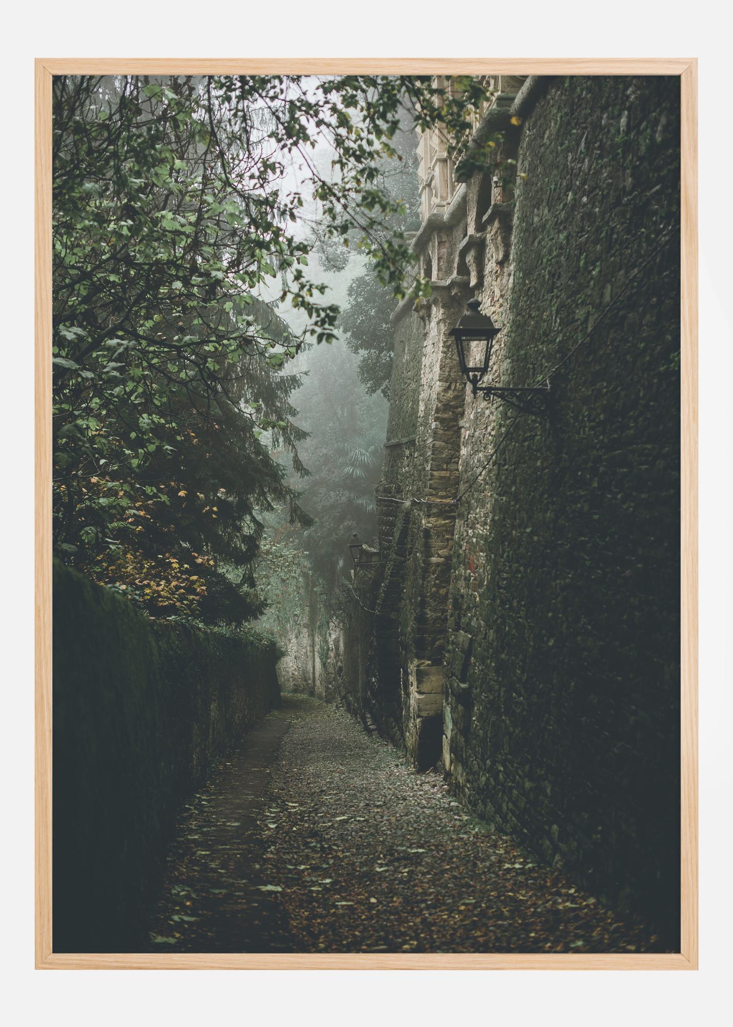 Cette affiche envoûtante capture une allée mystique et enchantée, enveloppée de brume et entourée par les murs de l'histoire. L'allée, bordée d'un mur couvert de mousse et de feuillage pendu silencieusement, donne l'impression d'être entré dans un autre monde. Une vieille lanterne fixée à la maçonnerie du bâtiment renforce la sensation historique et romantique que dégage cette image.