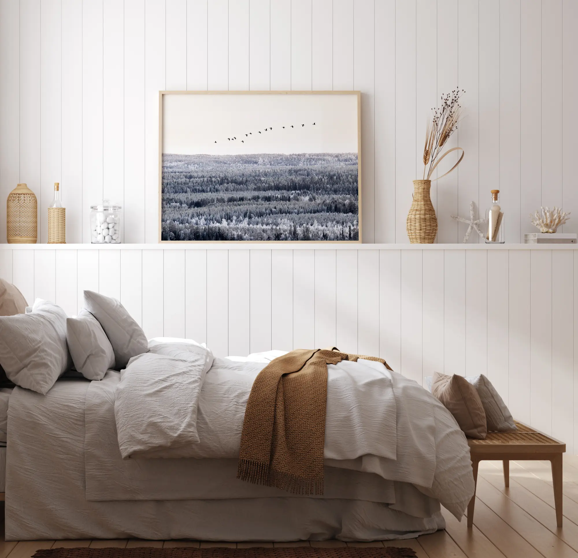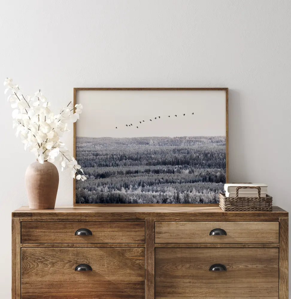 Un poster photographique d'un vol d'oiseaux migrateurs volant haut au-dessus des cimes des arbres. La forêt étendue se déploie dans des tons froids sous un ciel blanc. Un poster qui respire une merveilleuse sensation de liberté.