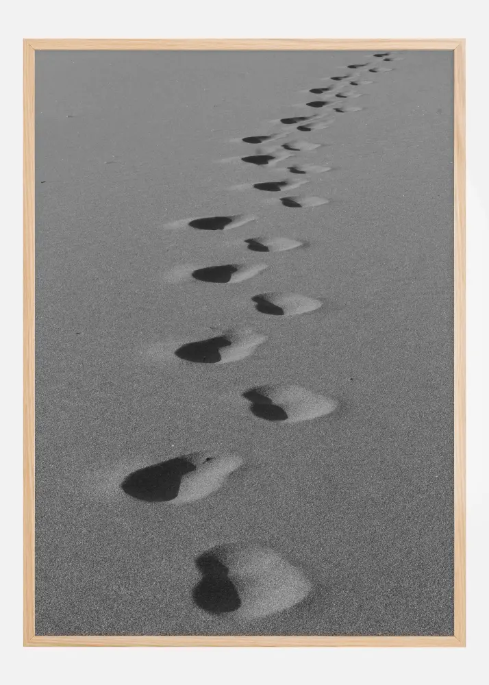 Cette affiche stimulante présente une série d'empreintes dans le sable, guidant le regard vers l'inconnu. La composition en noir et blanc offre une sensation classique et intemporelle, tandis que les traces dans le sable symbolisent un voyage, à la fois littéral et métaphorique. C'est une image qui invite à la réflexion sur les chemins que nous empruntons et les traces que nous laissons derrière nous.