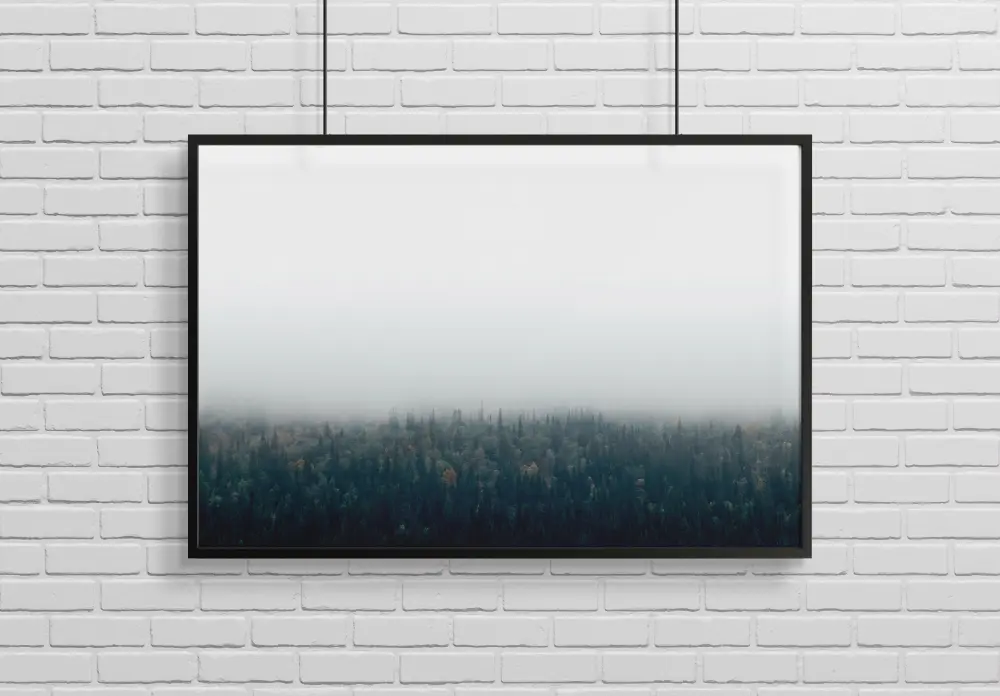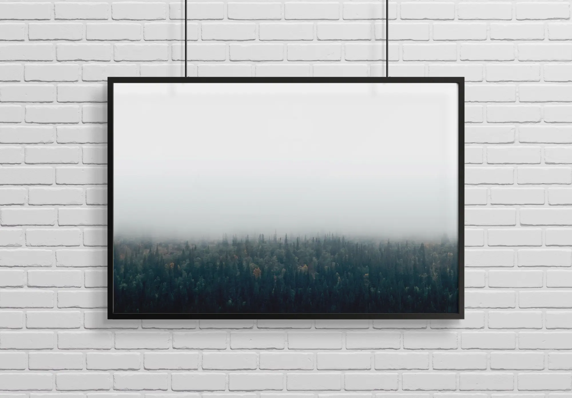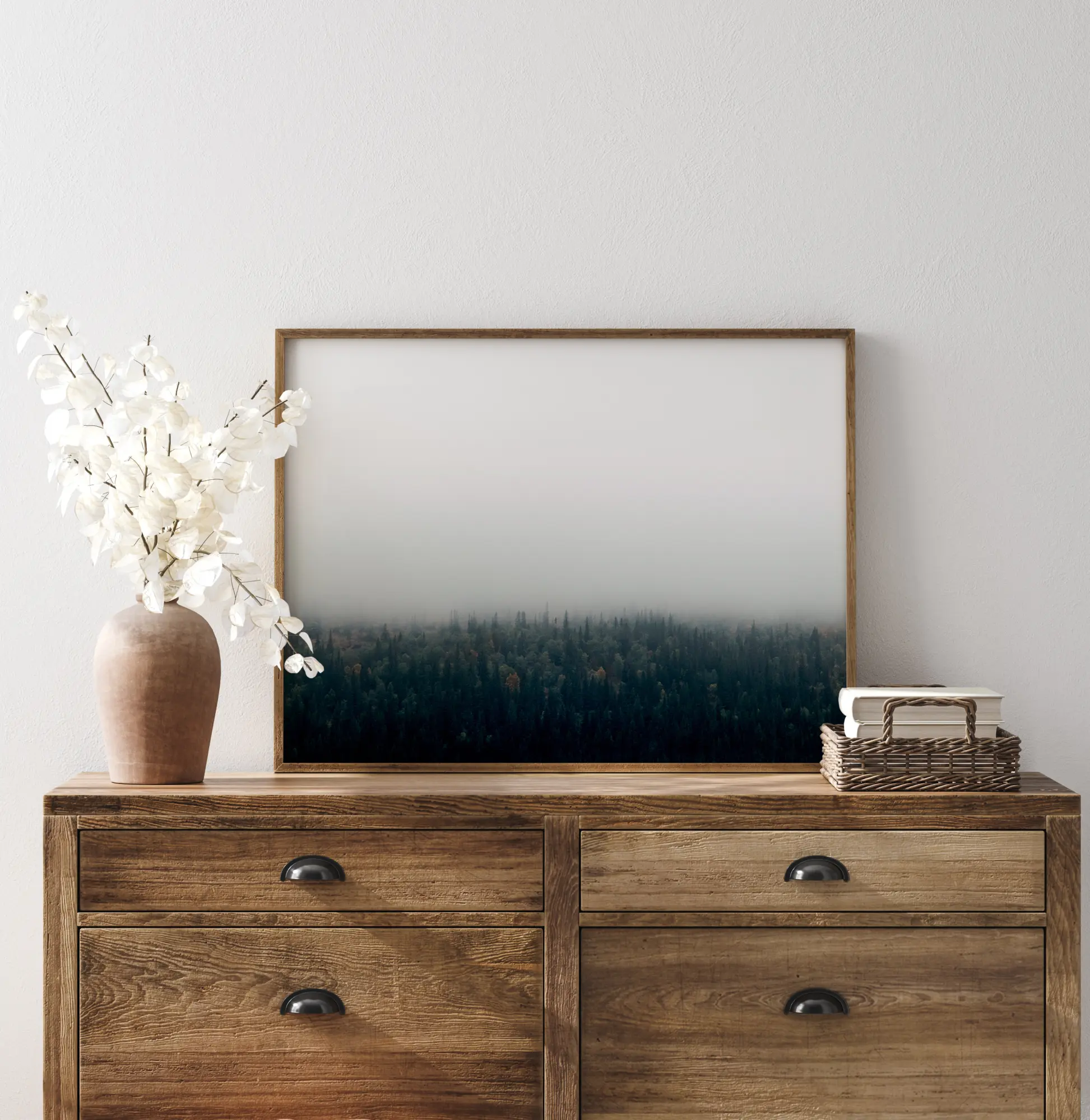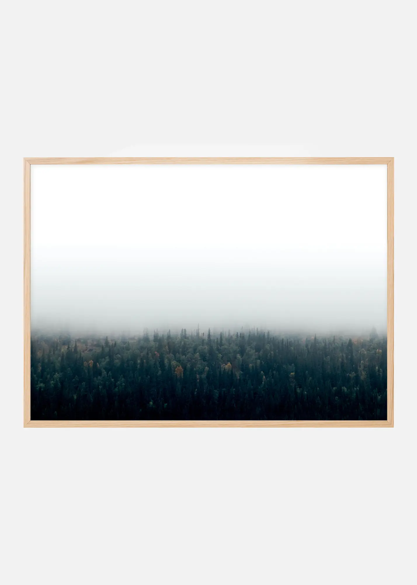 Un poster photographique d'une vaste forêt reposant sous un épais brouillard. Les arbres verts contrastent vivement avec le ciel blanc. Un beau poster proche de la nature qui est facile à combiner avec d'autres favoris. Pourquoi ne pas créer un plus grand mur de tableaux sur le thème de la nature ?