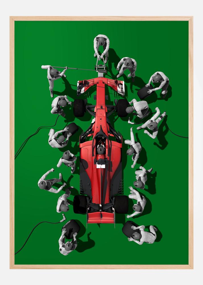 Avec une explosion de couleurs et d'action, cette affiche captivante offre un aperçu du monde rempli d'adrénaline de la Formule 1. Sur un fond vert audacieux, la scène emblématique d'un ravitaillement est représentée, où une équipe de mécaniciens en argent et blanc travaille en parfaite synchronisation autour d'une voiture de course rouge vif. Cette composition contrastée rend hommage à l'art de la vitesse et à la précision du sport automobile.