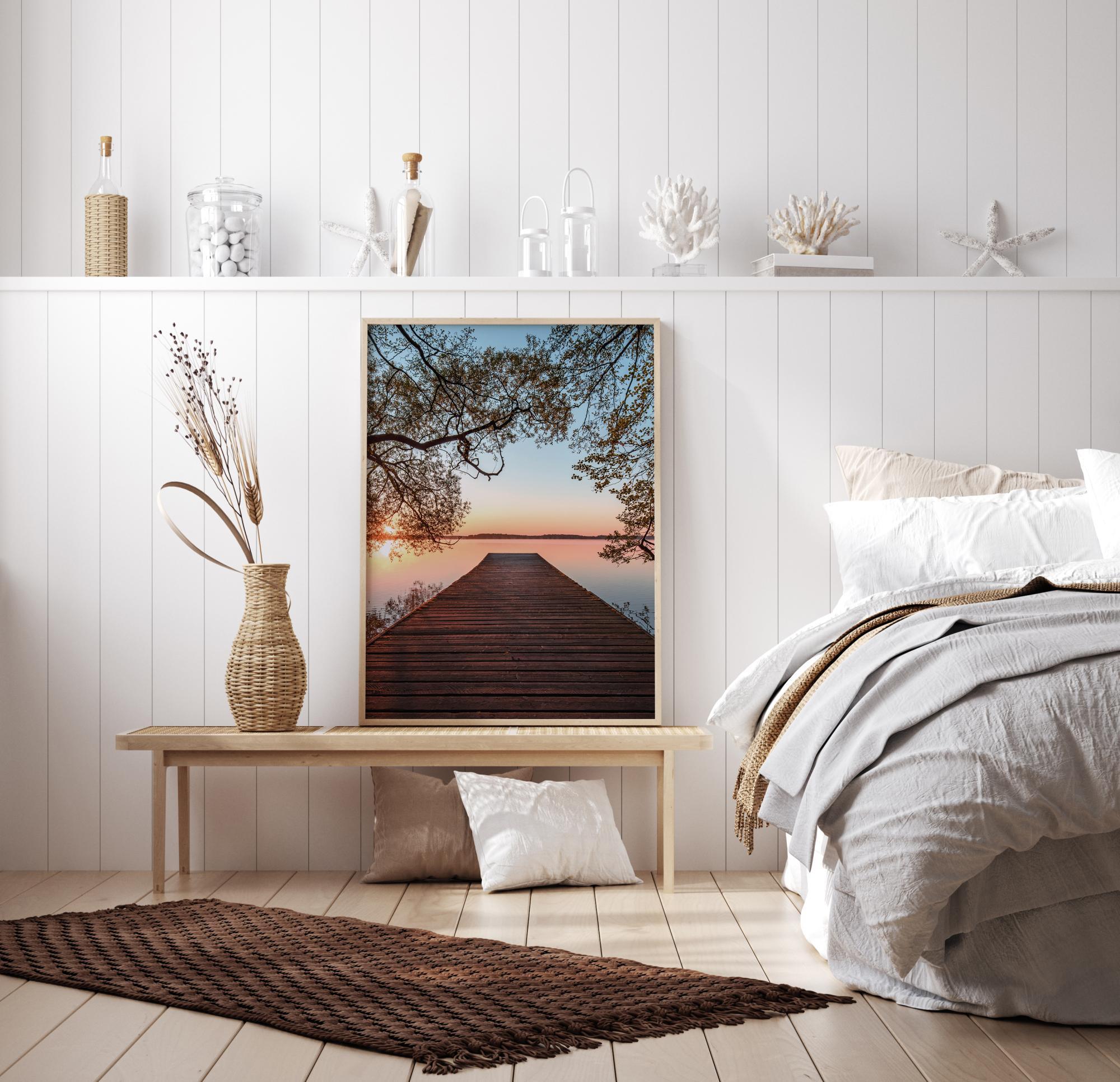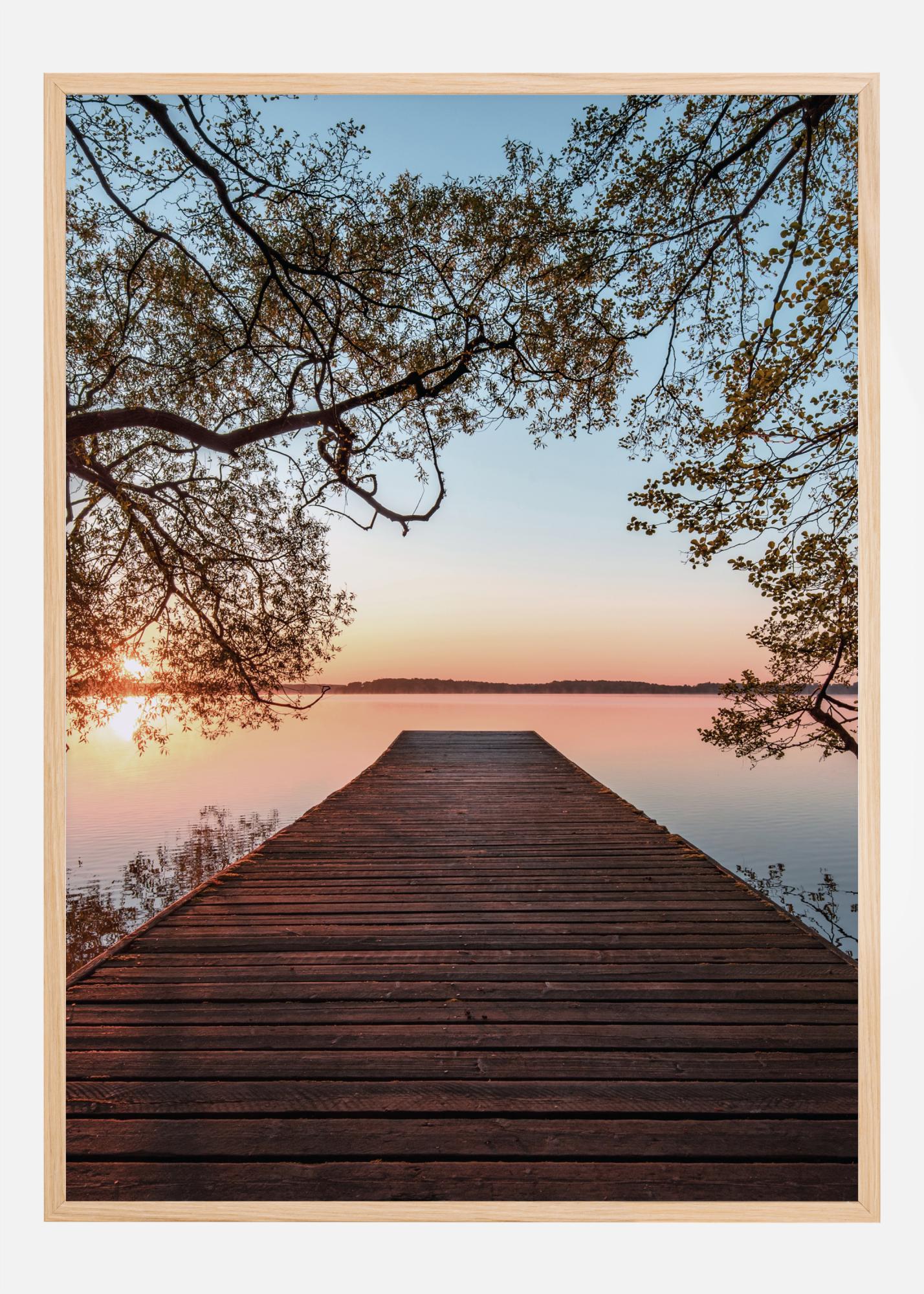 Une affiche représentant une passerelle qui se dirige vers un lac aux beaux jours. Des branches d'arbres encadrent la promenade vers le lac et le ciel bleu et pêche. Saisissez ce sentiment de liberté en emportant cette affiche chez vous.