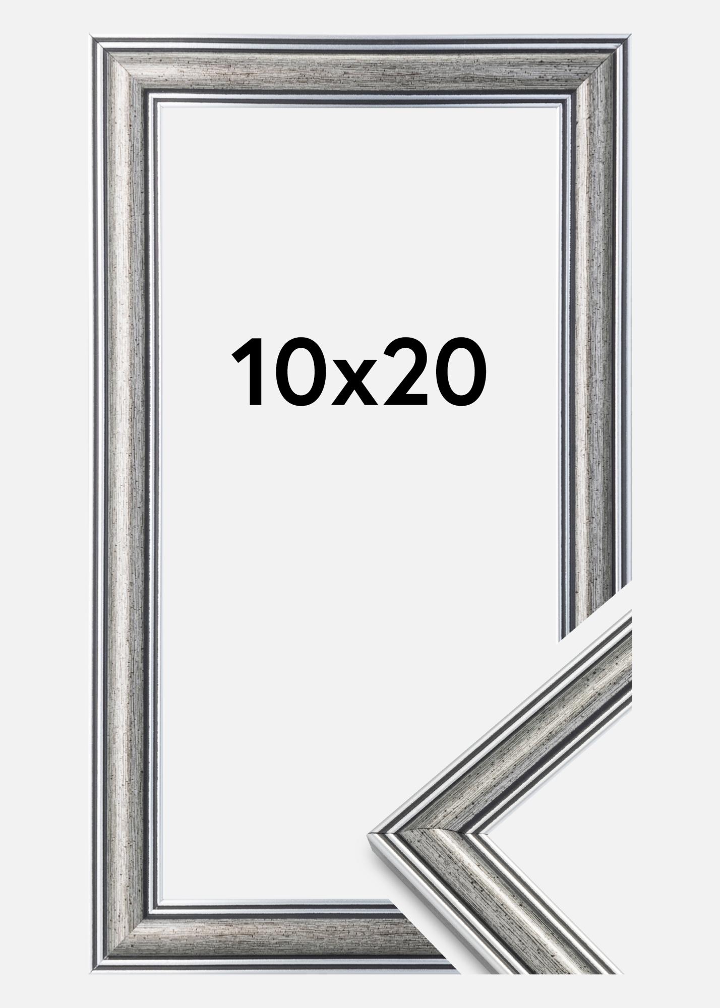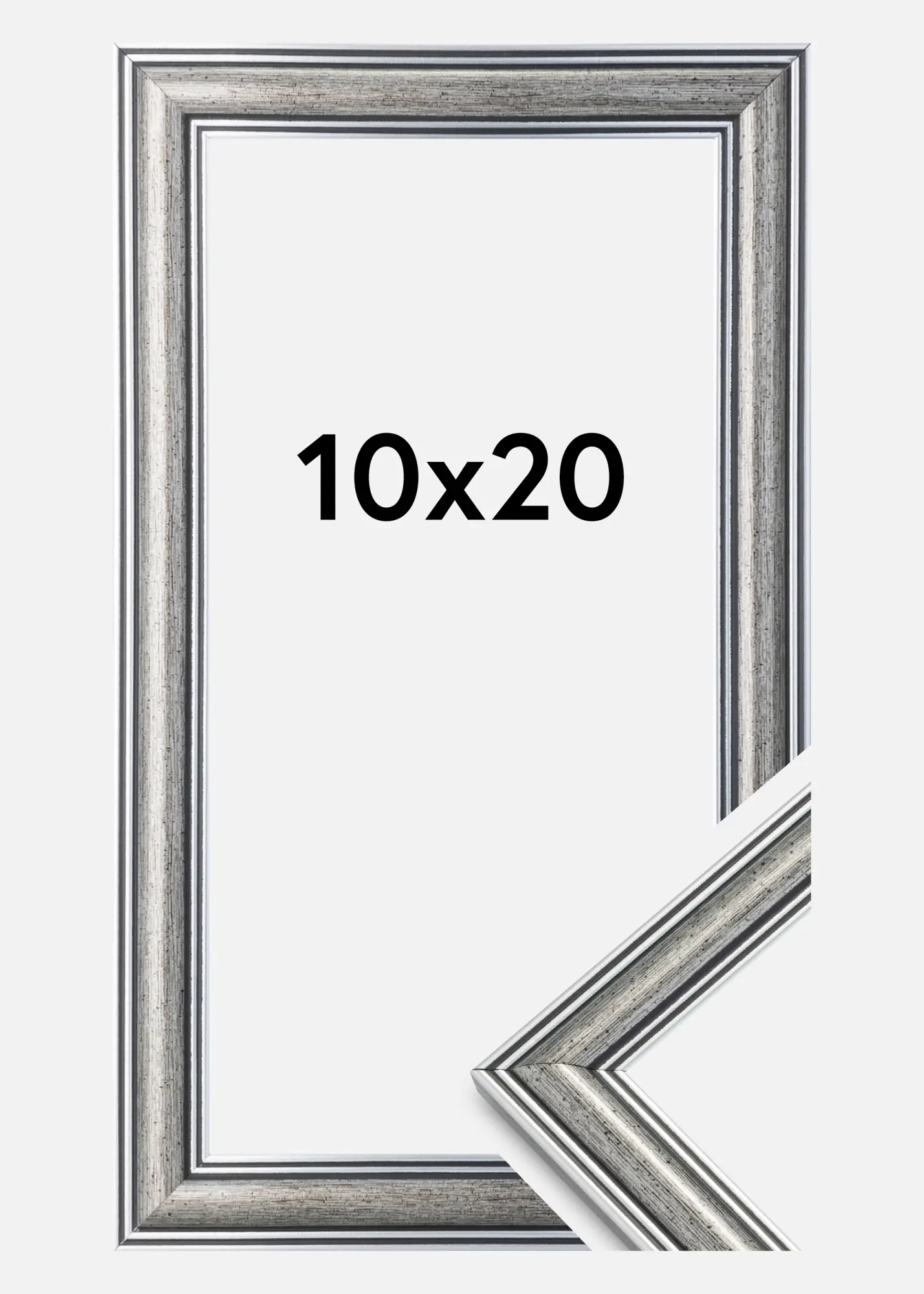 Frigg est un cadre argenté avec des lignes noires et des éléments tachetés en noir. Parfait lorsque vous recherchez un large cadre argenté traditionnel qui convient à de nombreux types d'images et de décorations.