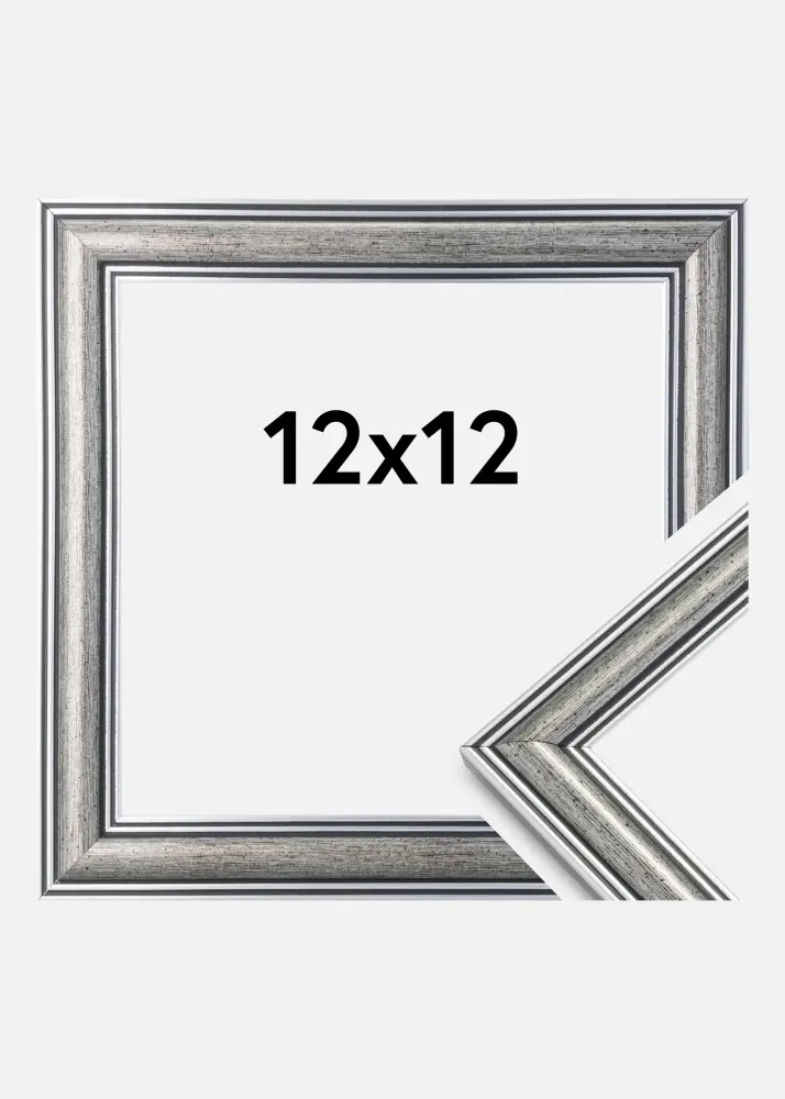 Frigg est un cadre argenté avec des lignes noires et des éléments tachetés en noir. Parfait lorsque vous recherchez un large cadre argenté traditionnel qui convient à de nombreux types d'images et de décorations.