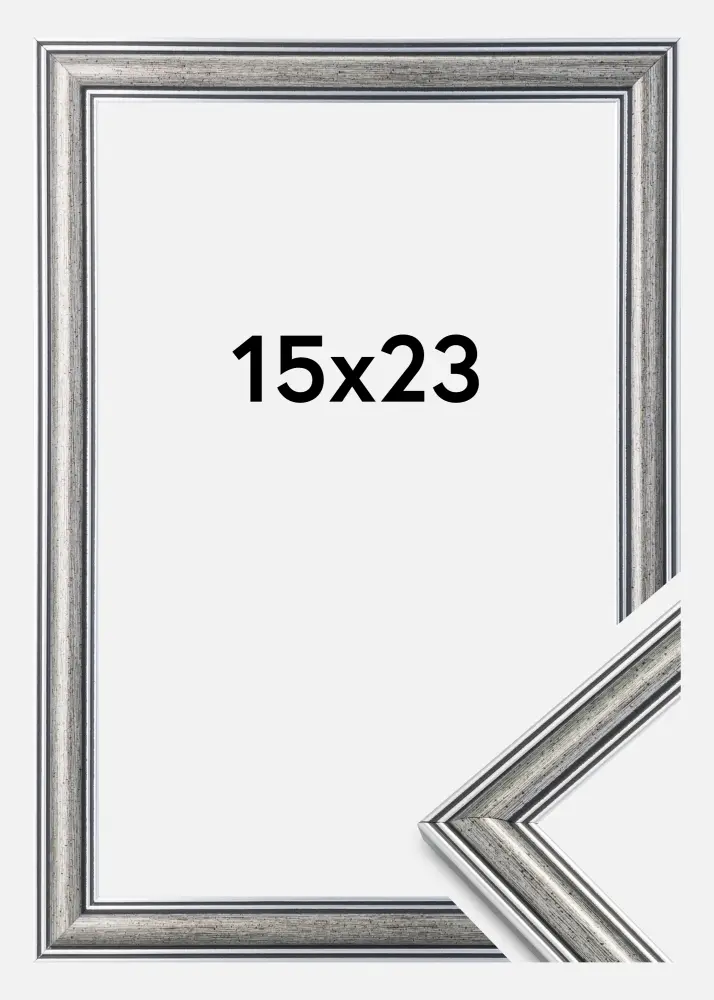 Frigg est un cadre argenté avec des lignes noires et des éléments tachetés en noir. Parfait lorsque vous recherchez un large cadre argenté traditionnel qui convient à de nombreux types d'images et de décorations.