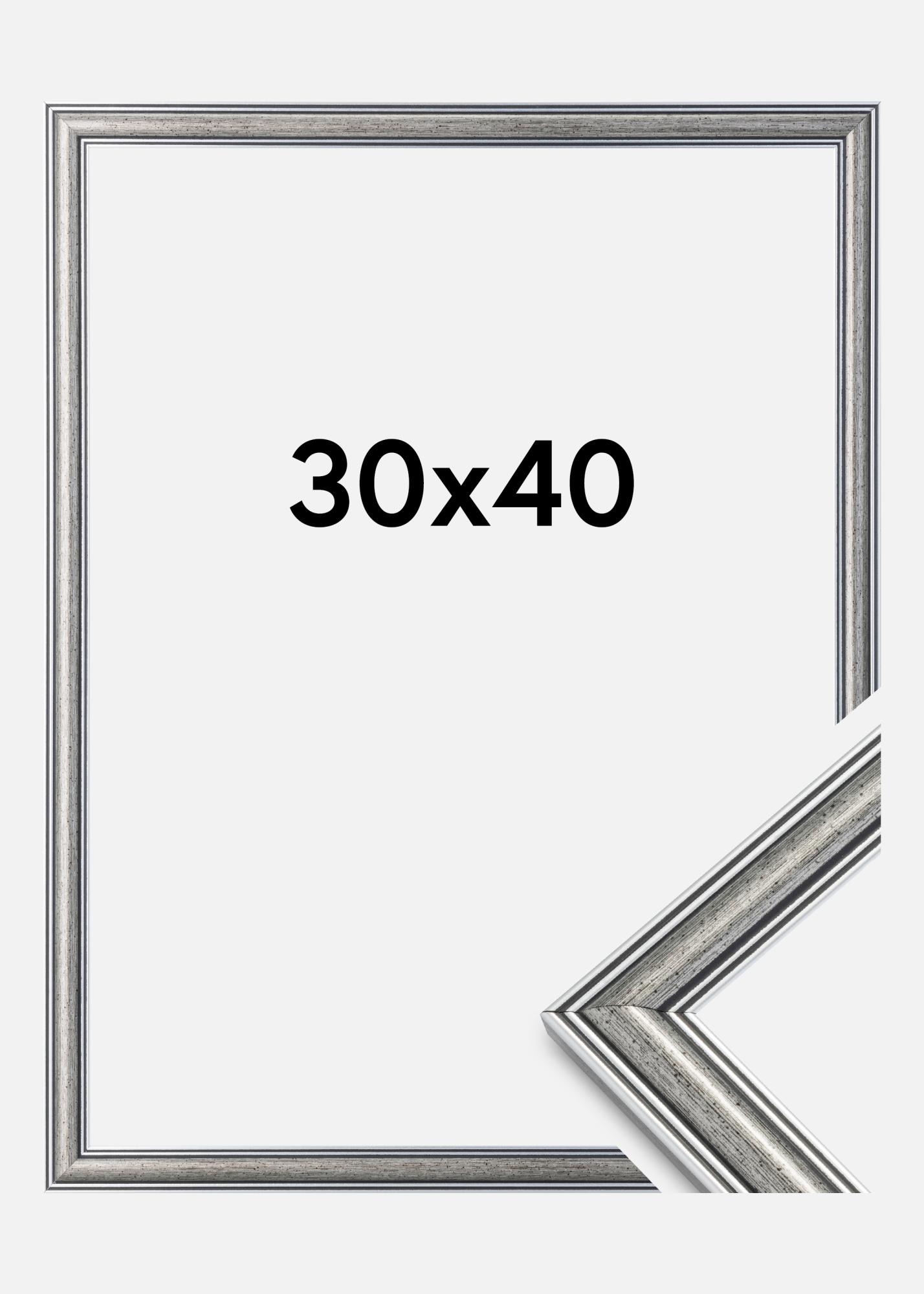 Frigg est un cadre argenté avec des lignes noires et des éléments tachetés en noir. Parfait lorsque vous recherchez un large cadre argenté traditionnel qui convient à de nombreux types d'images et de décorations.
