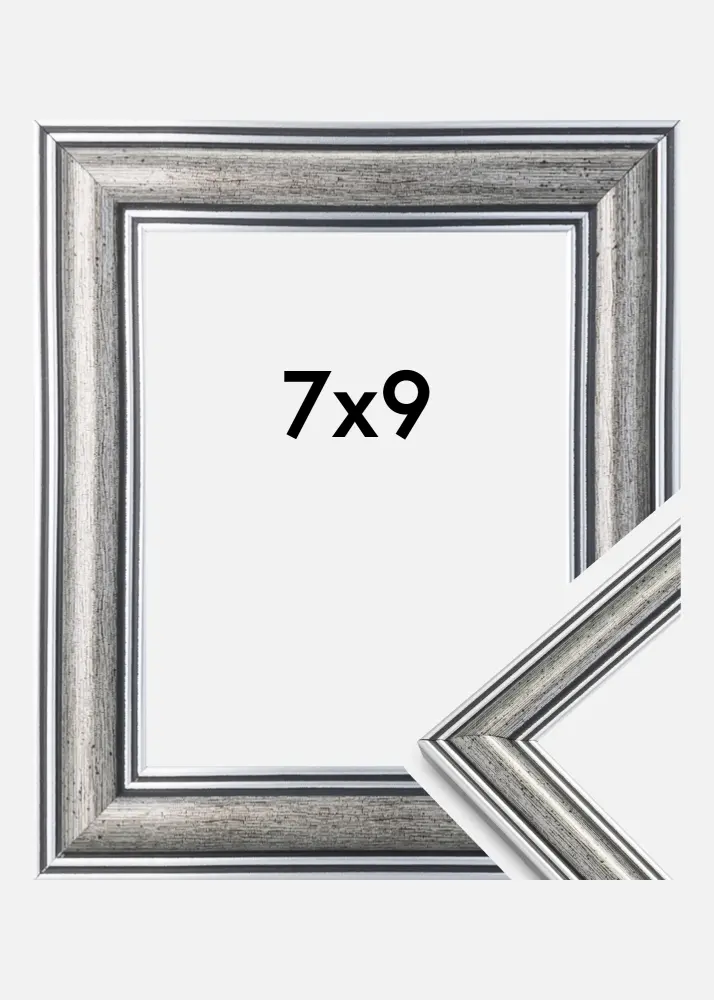 Frigg est un cadre argenté avec des lignes noires et des éléments tachetés en noir. Parfait lorsque vous recherchez un large cadre argenté traditionnel qui convient à de nombreux types d'images et de décorations.
