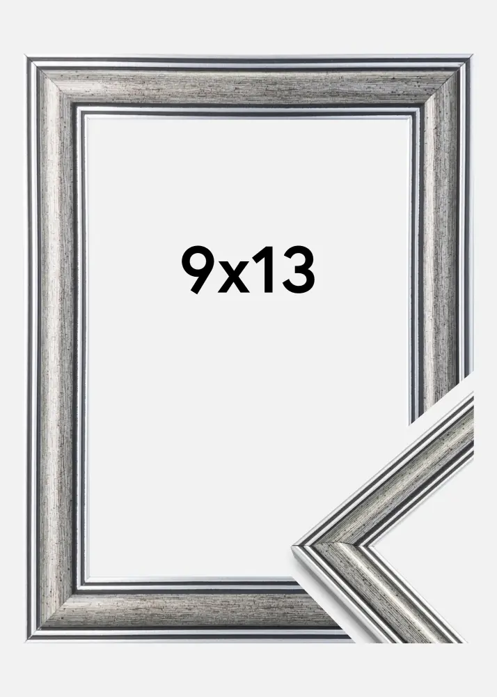 Frigg est un cadre argenté avec des lignes noires et des éléments tachetés en noir. Parfait lorsque vous recherchez un large cadre argenté traditionnel qui convient à de nombreux types d'images et de décorations.