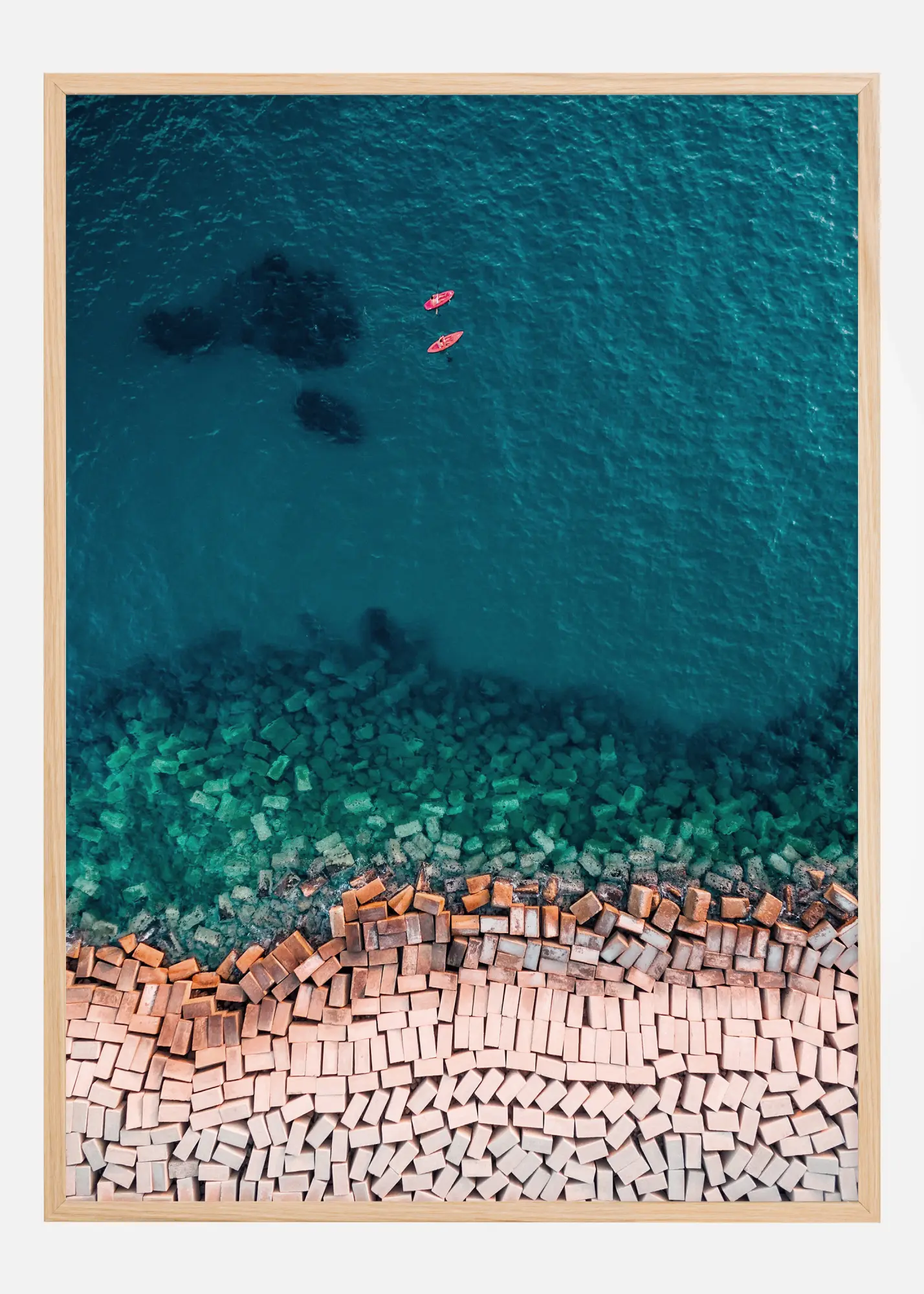 Ce poster offre une perspective fascinante à vol d'oiseau d'un kayak glissant sur des eaux cristallines, représenté contre un littoral rocheux. Les tons naturels du bleu et du vert de la mer se fondent avec les nuances chaudes des pierres sur la plage. La richesse des détails dans l'eau et la structure des pierres donnent une forte sensation de lieu et d'environnement.
