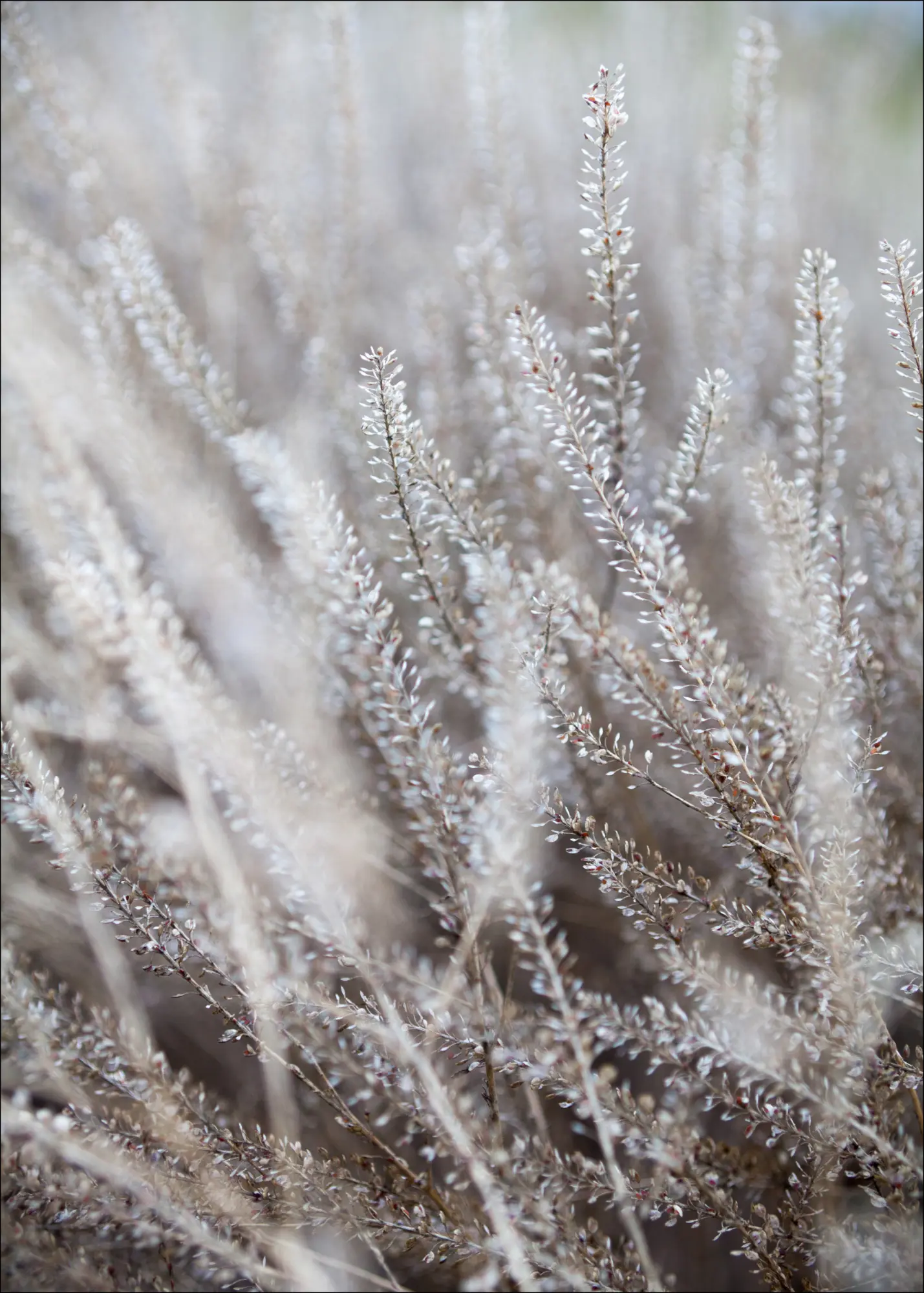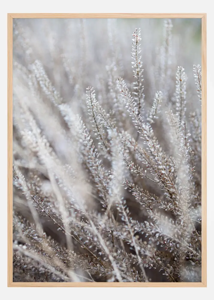 Une affiche hivernale d'herbes givrées. Les herbes délicates sont capturées individuellement dans cette image étonnante et plutôt magique. Les tiges se dressent et s’effacent dans le fond tandis que le champ d'herbe entier ondule doucement. Ajoutez cette image à un mur chaud pour lui donner une touche de couleur.