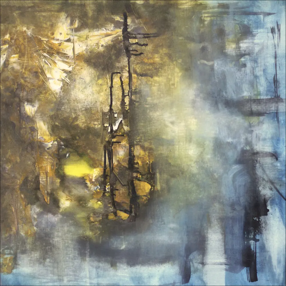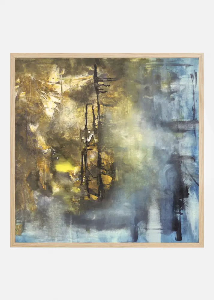 Une peinture abstraite en acrylique dans des nuances de jaune, bleu et noir, créée par l'artiste Linn Westanbäck. Un poster merveilleusement vivant au format carré qui peut être avantageusement combiné avec d'autres œuvres de Linn Westanbäck.