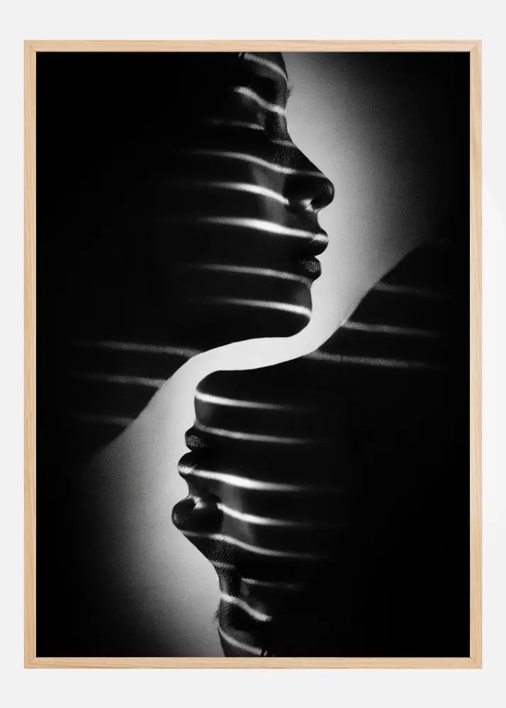 Un double portrait spectaculaire de deux visages de profil. Des barres de lumière brillent de façon incroyable sur ces visages sombres, avec un faisceau de lumière circulaire derrière, qui crée un halo. Accrochez-le sur un mur blanc pour renforcer l'effet spectaculaire de cette affiche en noir et blanc.