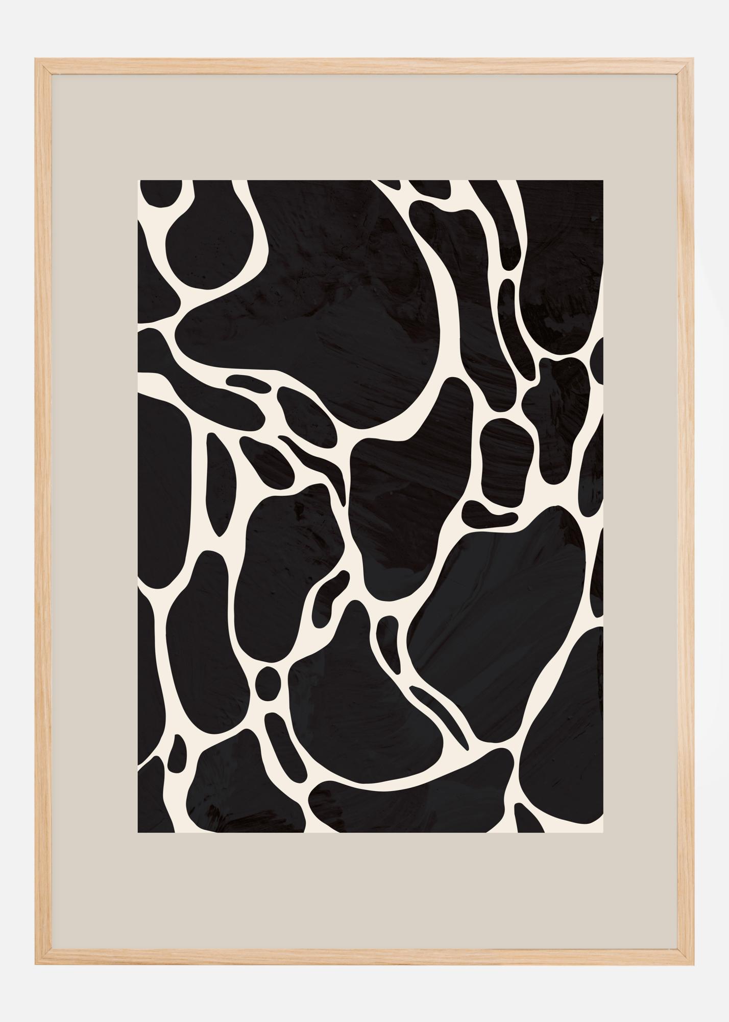 Une affiche graphique imprimé girafe en noir et blanc. Les grandes taches noires créent une image attrayante. Des tourbillons de pinceaux y ajoutent de la texture. Les lignes blanches épaisses qui croisent les taches de girafe créent du flux et un mouvement dans la pièce.