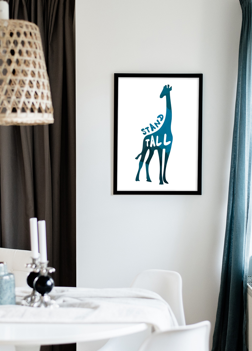 Poster bleu comme la langue d'une girafe ou dans ce cas, c'est toute la girafe qui est de cette couleur. L'affiche stylisée avec le texte encourageant - Stand tall - devient un beau cadeau à offrir à celui qui a besoin d'un peu d'encouragement pour tenir bon parfois. L'illustration graphique se combine bien avec d'autres prints et tableaux sur un mur de cadres avec un thème. Achetez un joli cadre à associer avec le poster qui s'intègre dans le reste de la décoration de la maison pour créer une sensation d'unité dans l'environnement.