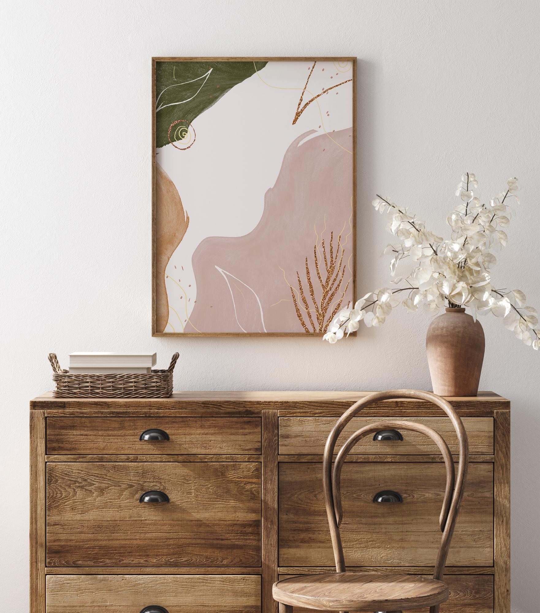 Un poster paisible et abstrait de feuilles avec des détails pailletés. De grands blocs de couleur en forme de feuilles remplissent cette affiche avec de petites branches créées à partir d'or scintillant. Associez-la à n'importe quelle couleur pastel pour une jolie touche sur votre mur.