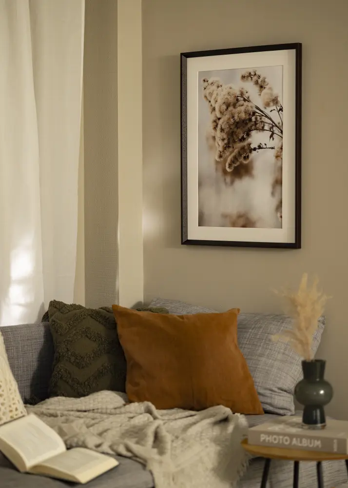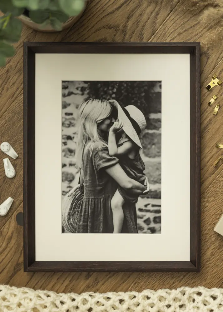 Cadre en bois à l'élégante couleur espresso avec un profil moderne au design nordique et fabriqué en Suède. Parfait lorsque vous recherchez un cadre photo près de la nature qui donne à votre motif une sensation d'élégance. Le cadre peut être placé aux formats paysage et portrait.