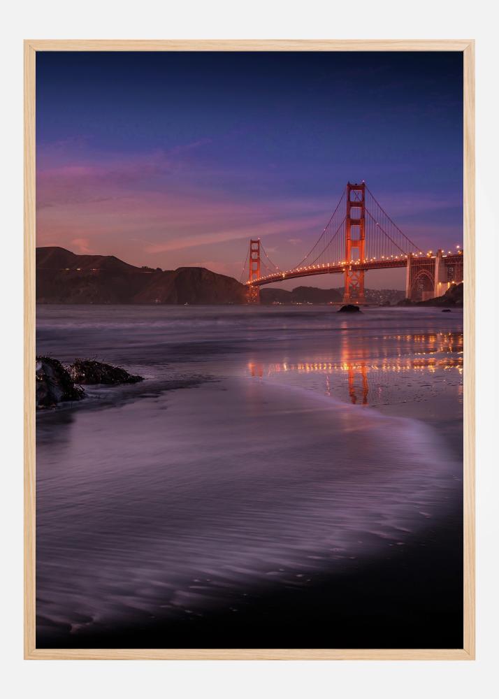 Une affiche nocturne du Golden Gate Bridge. Des lumières dorées éclairent ce pont célèbre et se reflètent dans l'eau en contrebas. Une partie de la plage se trouve au premier plan, la courbe de l'eau conduisant le regard vers le pont lui-même et le magnifique ciel bleu et or du coucher du soleil. Plongez dans cette superbe photo de nuit.