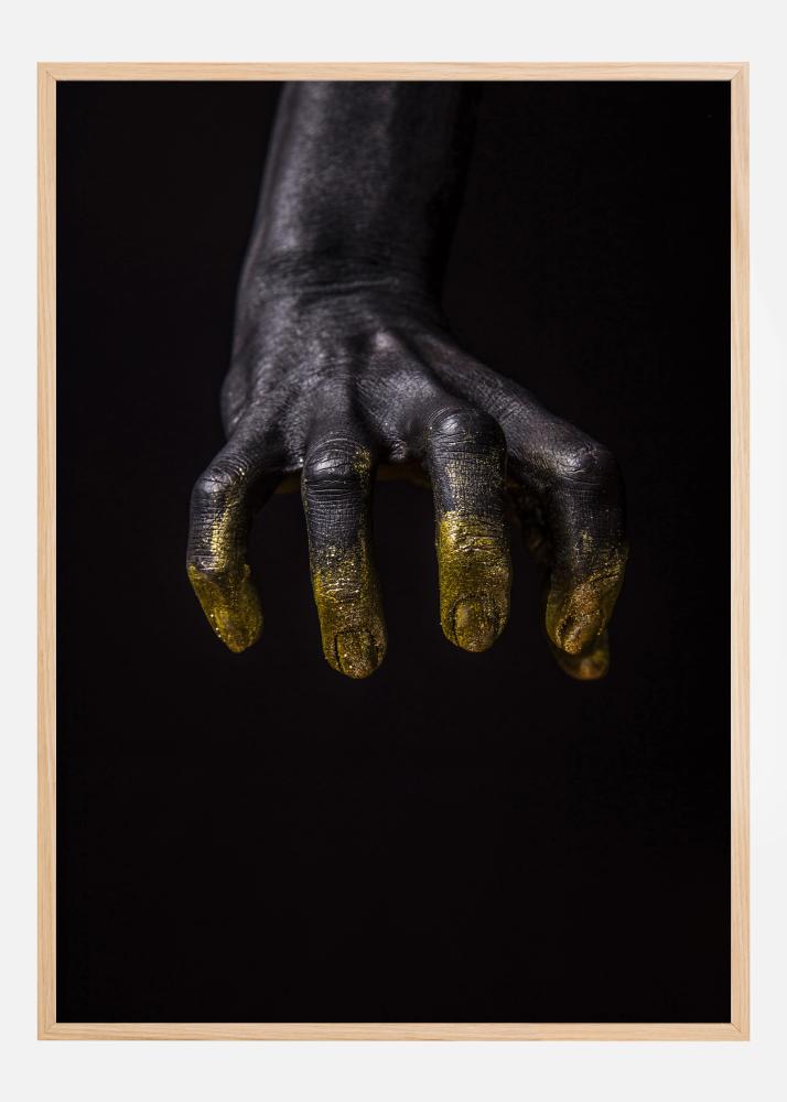 Une affiche spectaculaire d'une main griffue qui se tend vers le bas. Une main noire arrive par le haut de la photo, les doigts sont pliés et prêts à s'agripper à quelque chose. Le bout des doigts est recouvert d'or scintillant pour un look exceptionnel. Ajoutez cette impression épique à votre intérieur.