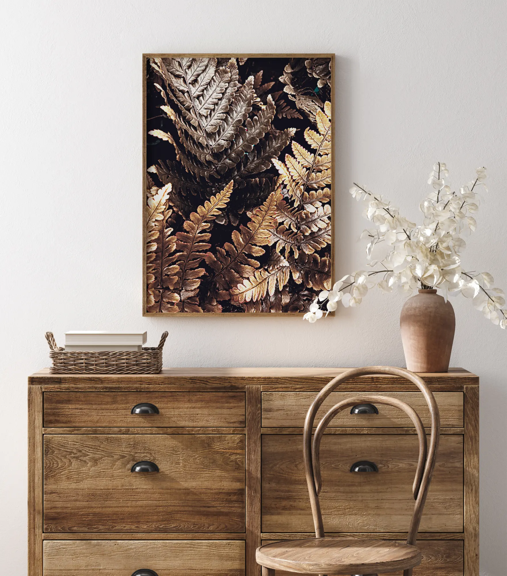 Une simple affiche nature représentant des frondes de fougères dorées. Les frondes remplissent le poster en se déplaçant sur l'image dans des couleurs et des tons différents. Des tons or chauds et doux créent une ambiance douce et une sensation naturelle. Vous pouvez presque tendre la main et toucher leurs feuilles texturées.