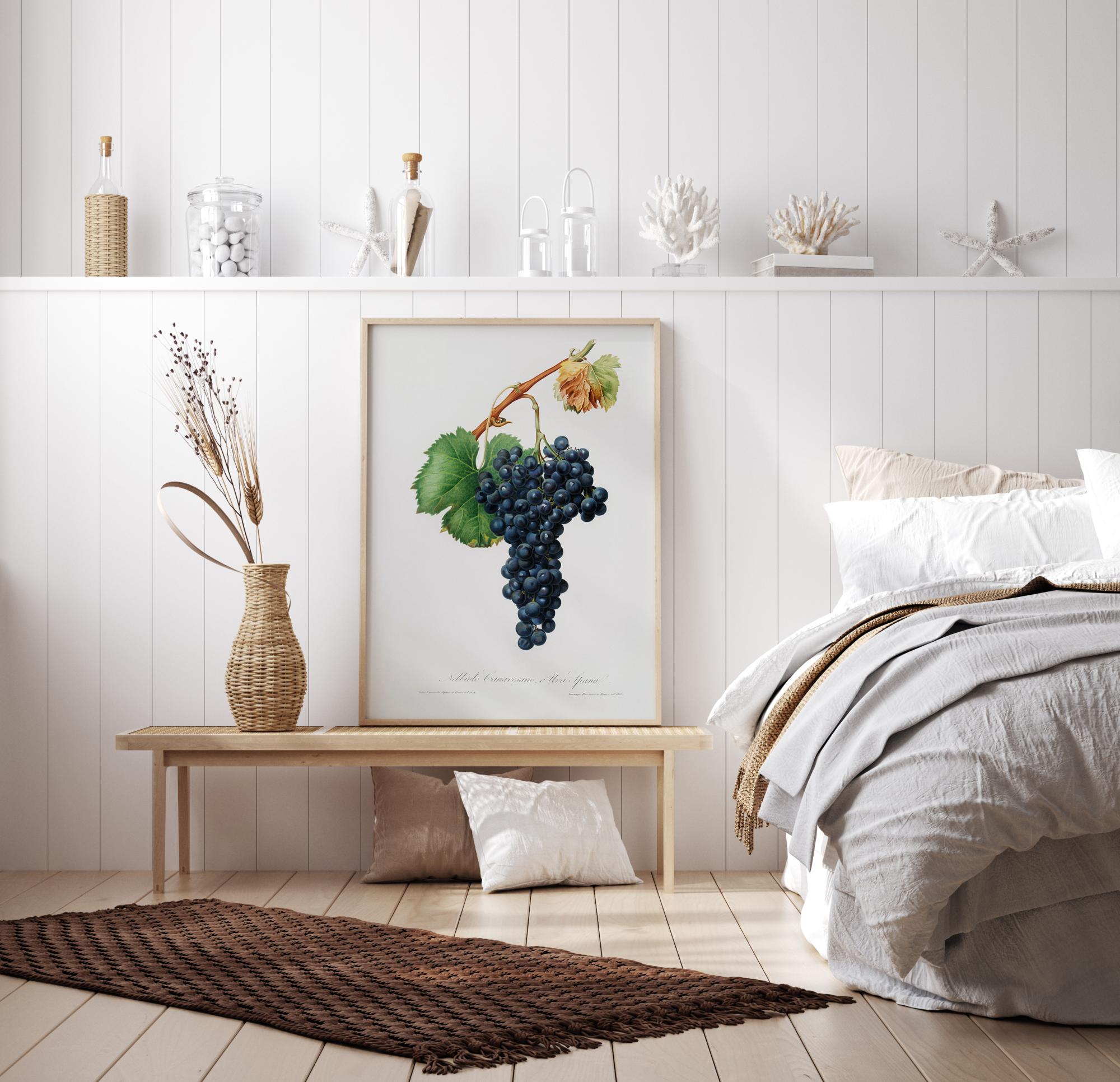 Affiche botanique détaillée d'une grappe de raisins noirs sur une vigne,sur fond blanc. Les raisins noirs brillants ont l’air succulents et juteux. Ils pendent de manière alléchante au centre de l'image. Accrochez cette affiche dans votre cuisine pour vous donner l’eau à la bouche.