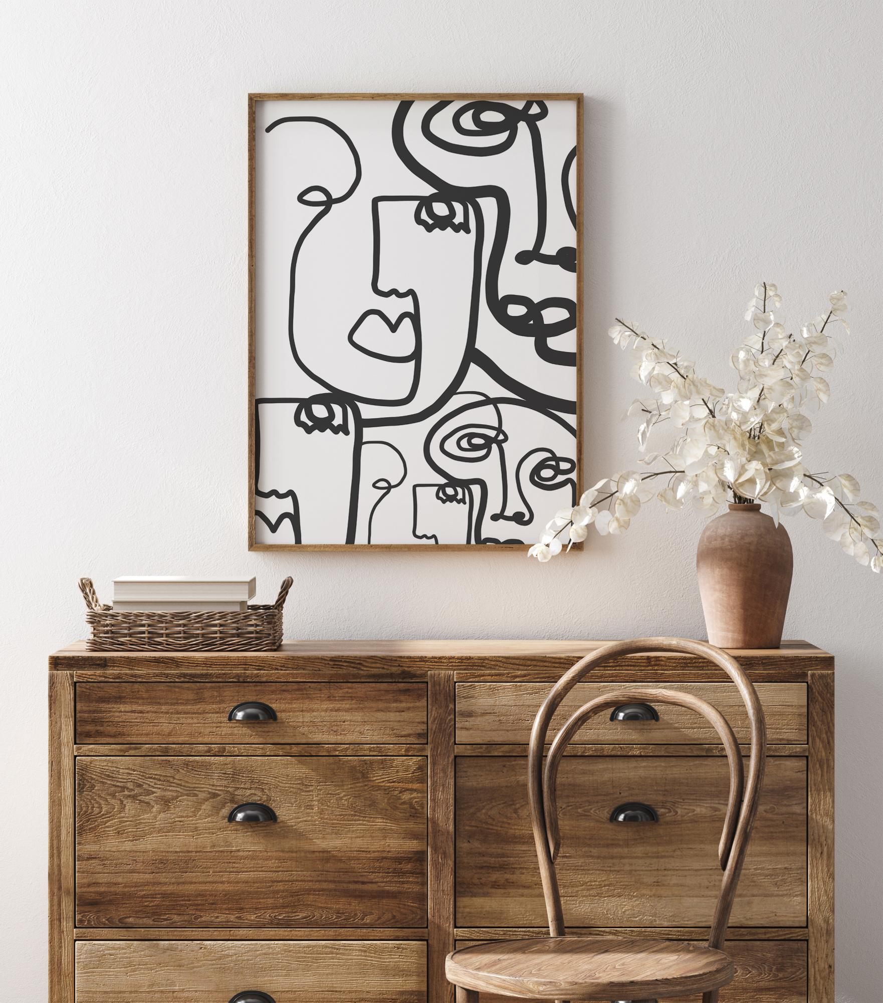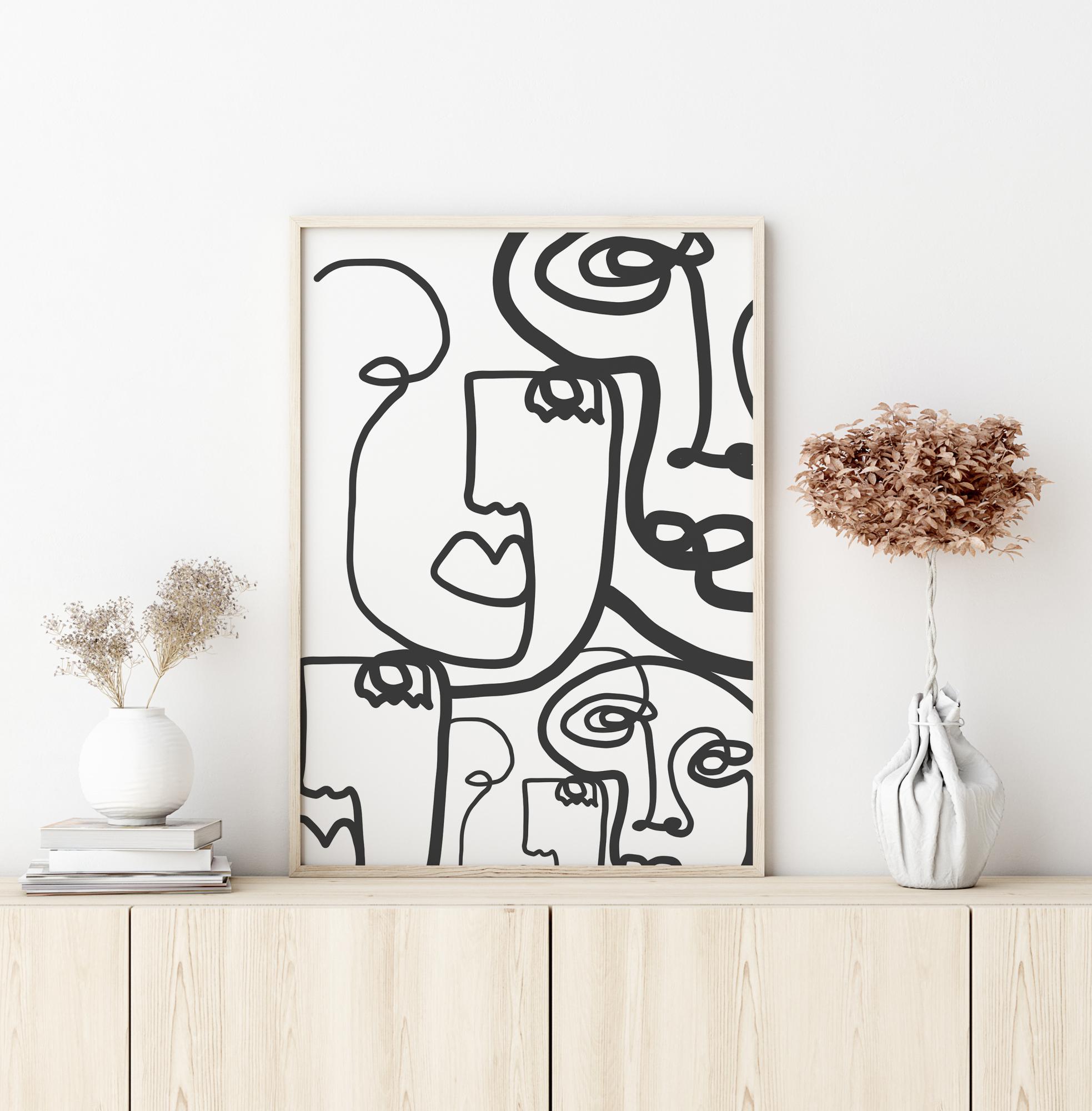 Une affiche abstraite spectaculaire avec de nombreux visages dessinés au trait. Des lignes noires épaisses et fines remplissent cette image pour créer cinq visages distincts. Les lignes tourbillonnent sur le fond blanc et vous devez vous concentrer pour trouver tous les visages cachés de cette image.