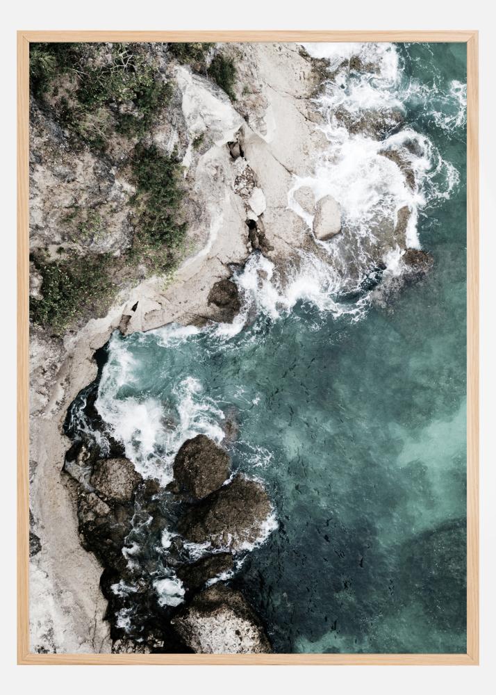 Une affiche aérienne de la mer avec les vagues qui s'écrasent contre les rochers. Appréciez la beauté de cette image en admirant la mer bleue cristalline se fracassant contre les rochers couverts d'algues. La beauté de cette image vous permet presque de sentir la fraîcheur de l'air.