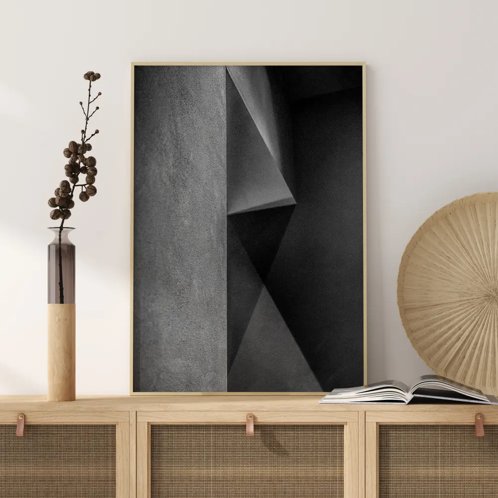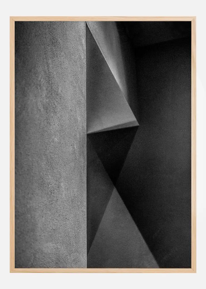 Une affiche géométrique d'ombres qui forment des triangles gris. Placez-la sur un mur simple aux couleurs vives et apportez un peu d'expressionnisme abstrait à votre intérieur.