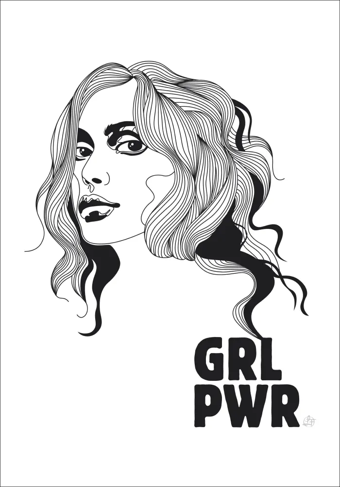 Un poster avec une illustration graphique pleine d'attitude et avec les messages Girl Power (grl pwr), créé par Linda Forsberg. Un poster de texte simple et épuré avec un message clair.