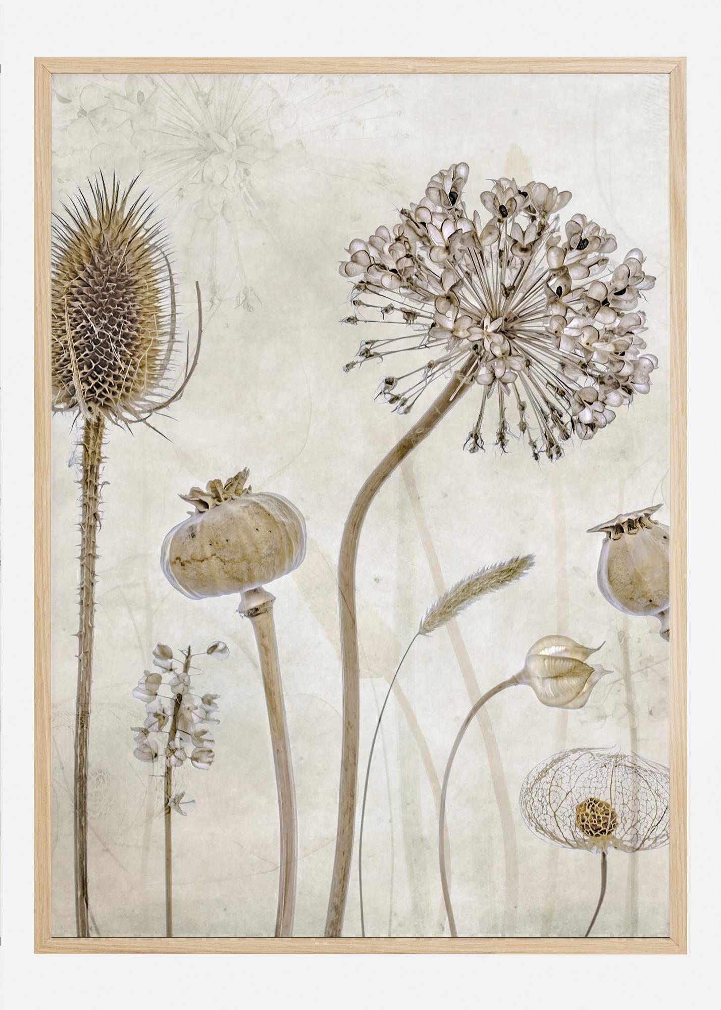 Une affiche élégante d'herbes séchées. Les délicates couleurs beiges créent un sentiment de calme et de chaleur. Avec les herbes séchées flottant dans le vent, ce portrait crée un sentiment de tranquillité. Ajoutez cette image délicate à votre cuisine pour créer cette ambiance de vie naturelle.