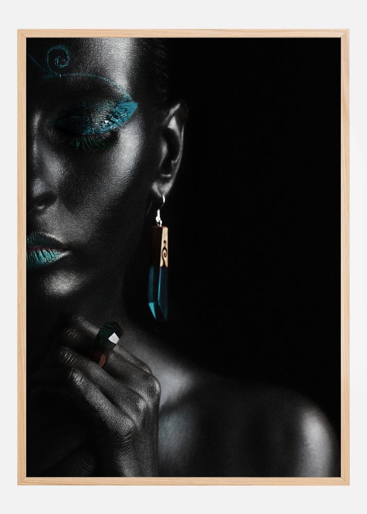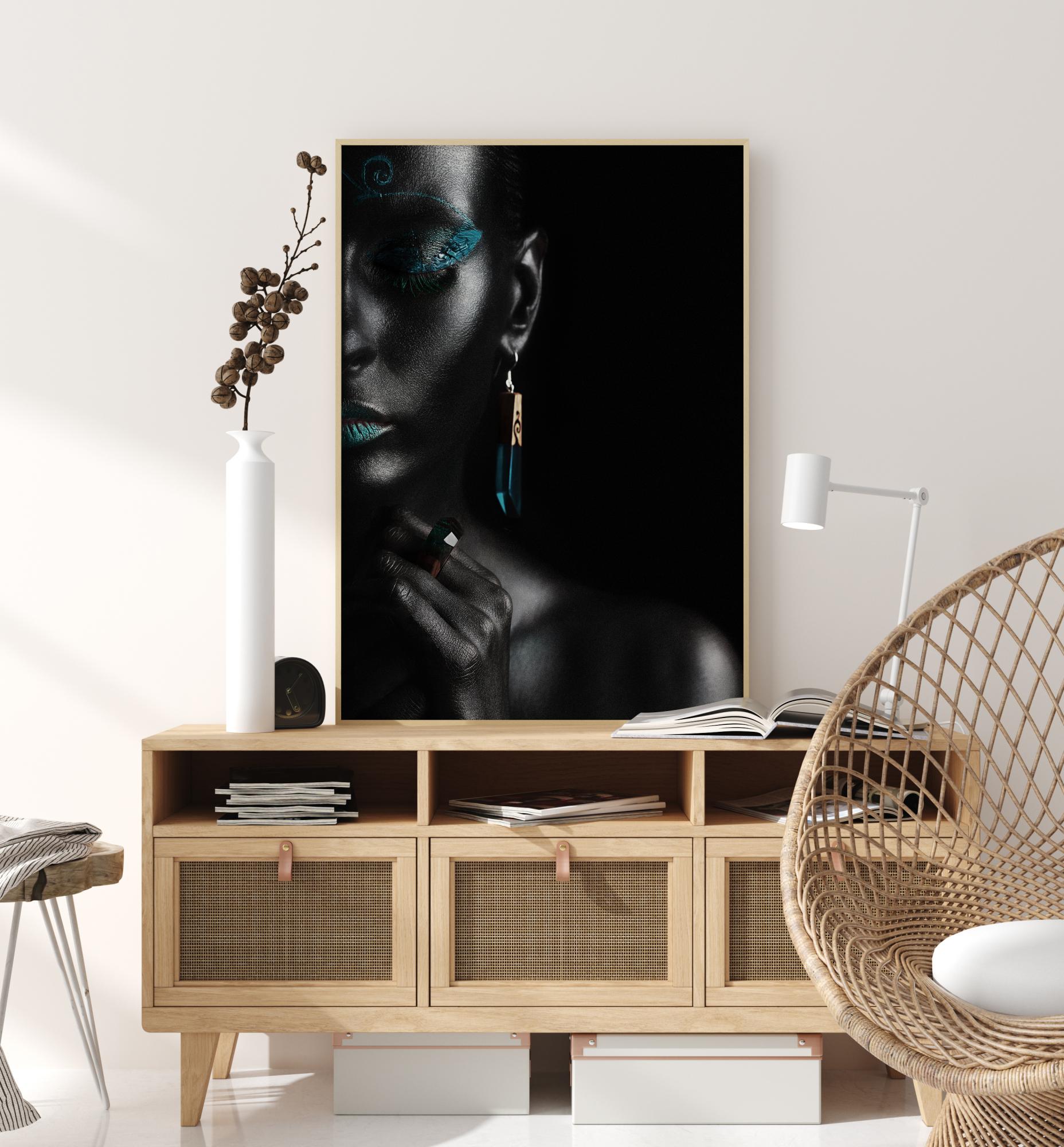 Un portrait à couper le souffle représentant une belle femme plongée dans ses pensées. Peint sur un fond noir, les yeux et la bouche de la femme sont rehaussés d'un vert turquoise profond. La lumière de la fenêtre éclaire son visage. Elle capte tous les détails, ce qui en fait un portrait parfait pour un mur blanc nu.
