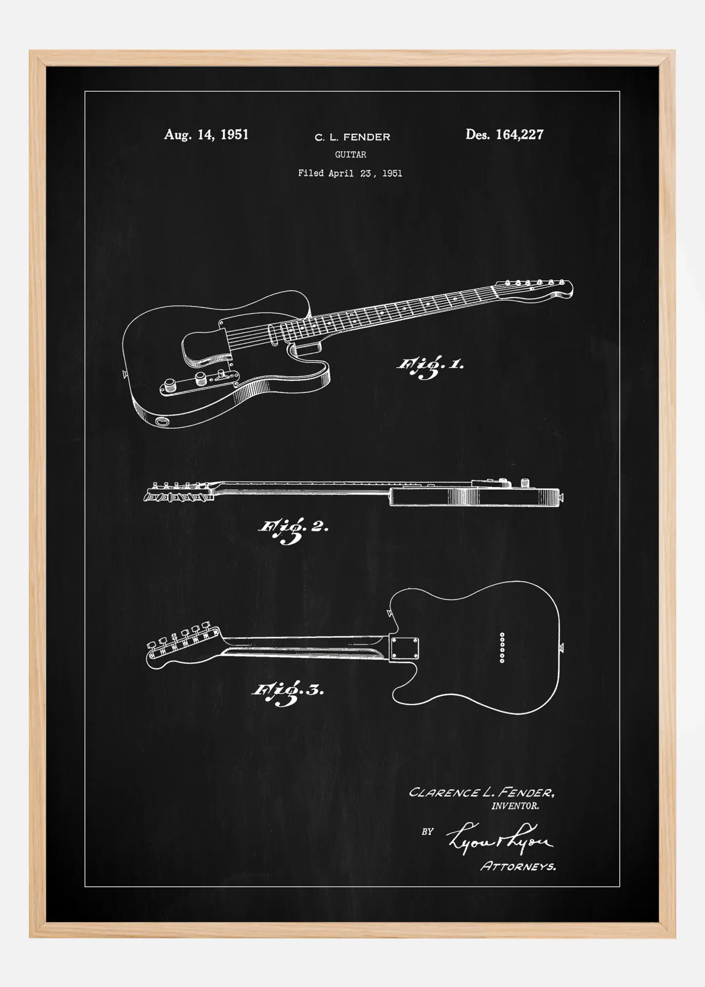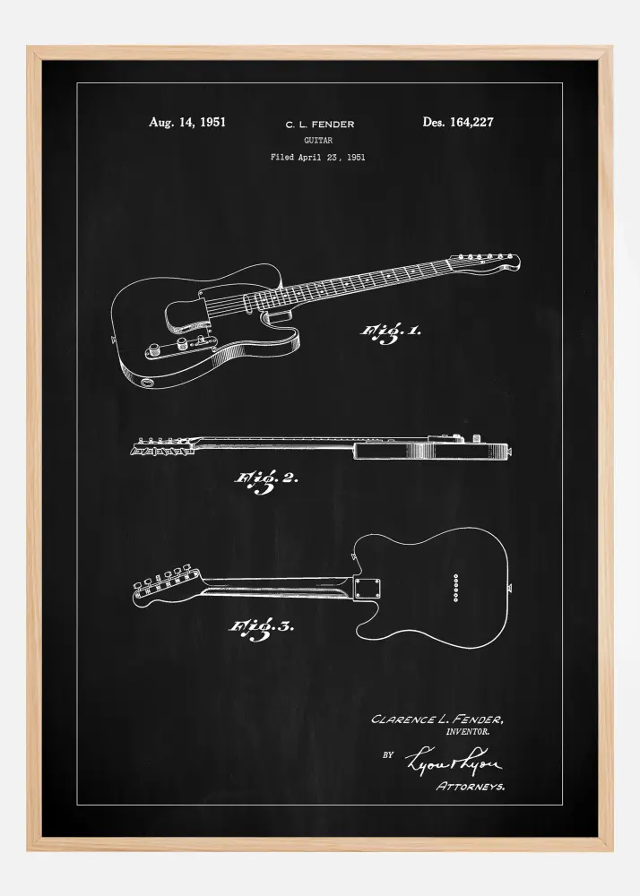 Ce poster de brevet avec un fond de tableau noir crée un effet visuel fort, parfait pour mettre en valeur le design de la guitare électrique de Clarence L. Fender, numéro de brevet 164,227 du 14 août 1951. Les contours et détails iconiques de la guitare se dessinent nettement sur le fond, offrant une présentation claire et distincte de l'instrument depuis trois perspectives différentes.