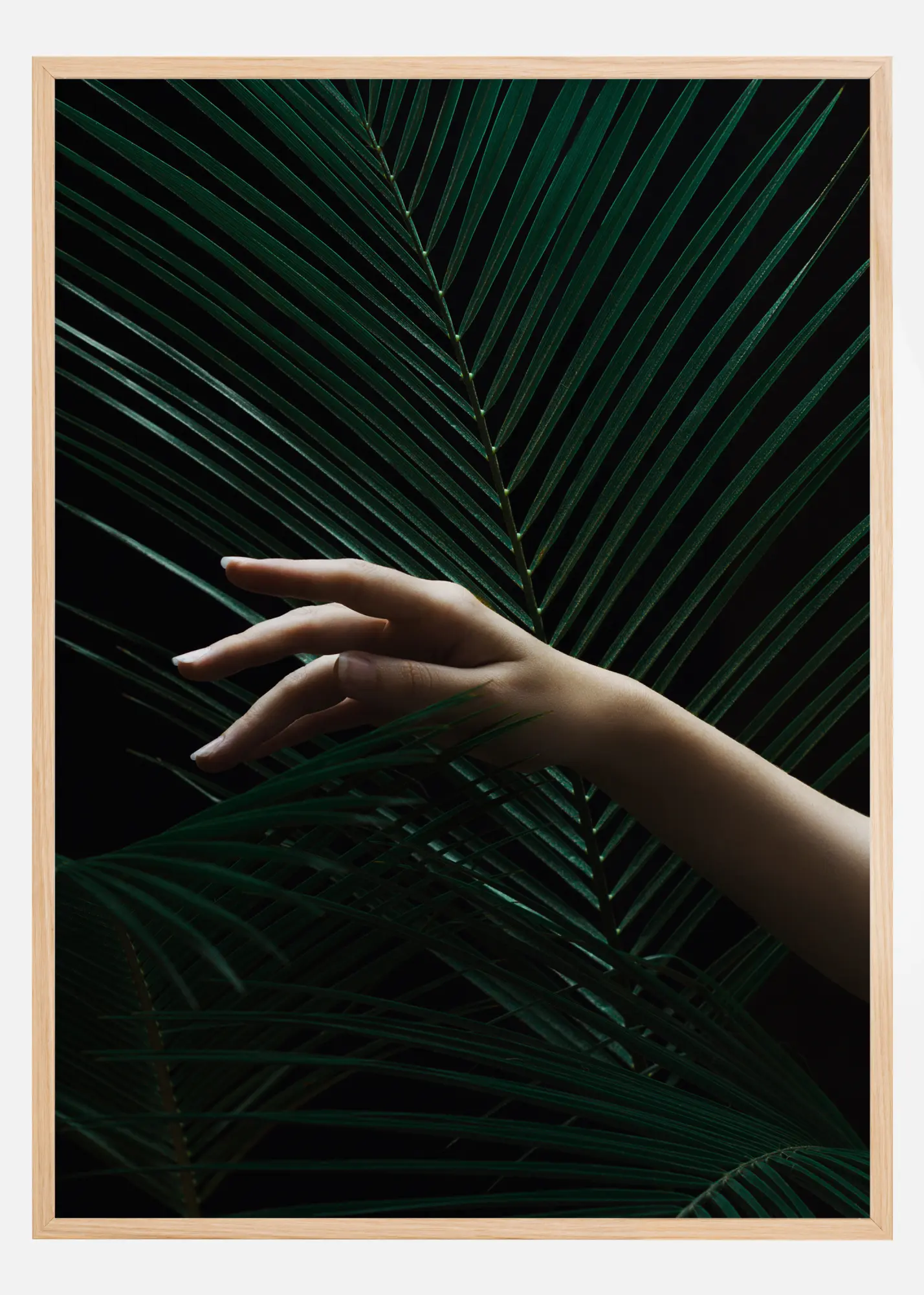 Une photographie botanique de branches ressemblant à des palmiers verts devant un fond noir. Une main tendue apporte une touche vivante et contrastante. Un poster sombre qui est parfait pour un grand mur de tableaux.