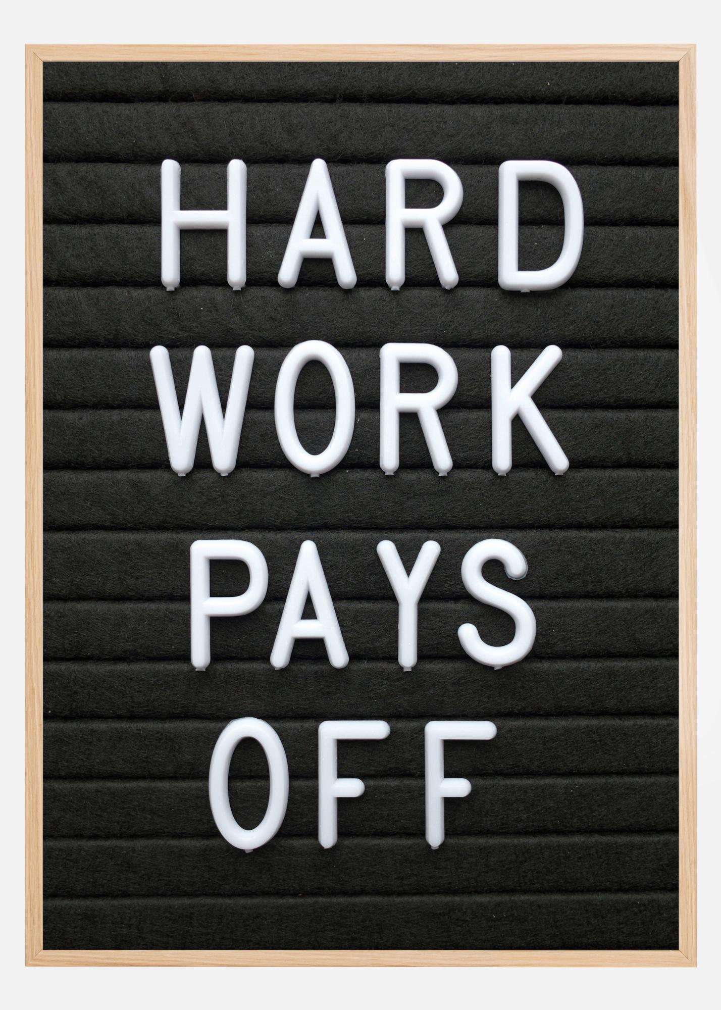Une affiche simple mais efficace où les mots "Hard Work Pays Off'' sont inscrits. Des lettres majuscules blanches sur un fond noir donnent de la force au message. Une impression parfaite à accrocher dans un bureau sur un mur blanc.