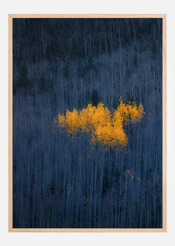 Une affiche étonnante représentant un bois vert foncé et bleu nuit. Au centre de l'image, la cime des arbres est surlignée en jaune, ce qui ajoute un peu de couleur au tableau. Un beau poster à accrocher dans un salon pour créer une atmosphère relaxante.
