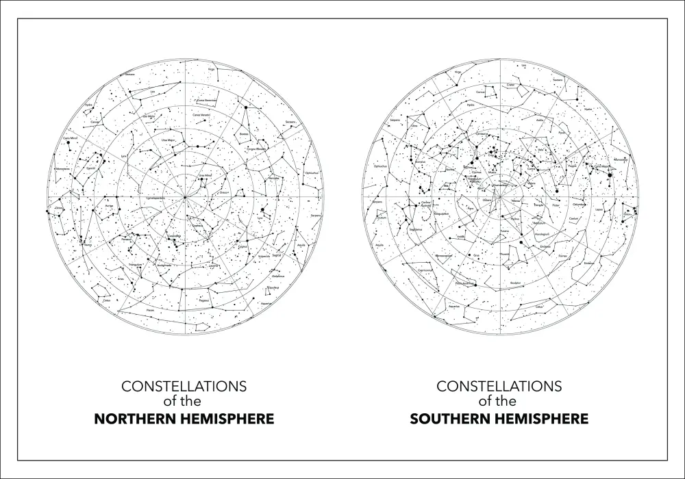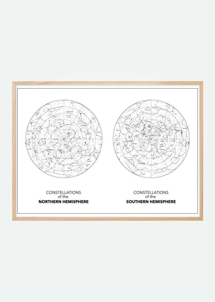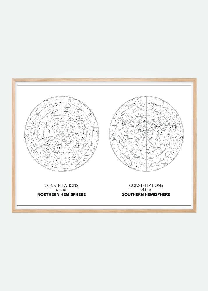 Une affiche en noir et blanc des hémisphères nord et sud. Sur un fond blanc, les constellations sont légèrement soulignées en noir. Placé côte à côte, vous pouvez admirer le mystère des étoiles. Accrochez cette affiche dans votre bureau et créez un sentiment d'infini.