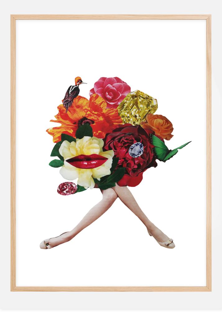 Une affiche colorée d'une femme qui se cache derrière une belle composition de fleurs colorées. Un délicieux papillon vert, trois bijoux inestimables, des lèvres parfaitement proportionnées et une magnifique huppe composent les fleurs. Sur un fond blanc, cette impression colorée et amusante égayera n'importe quel mur.