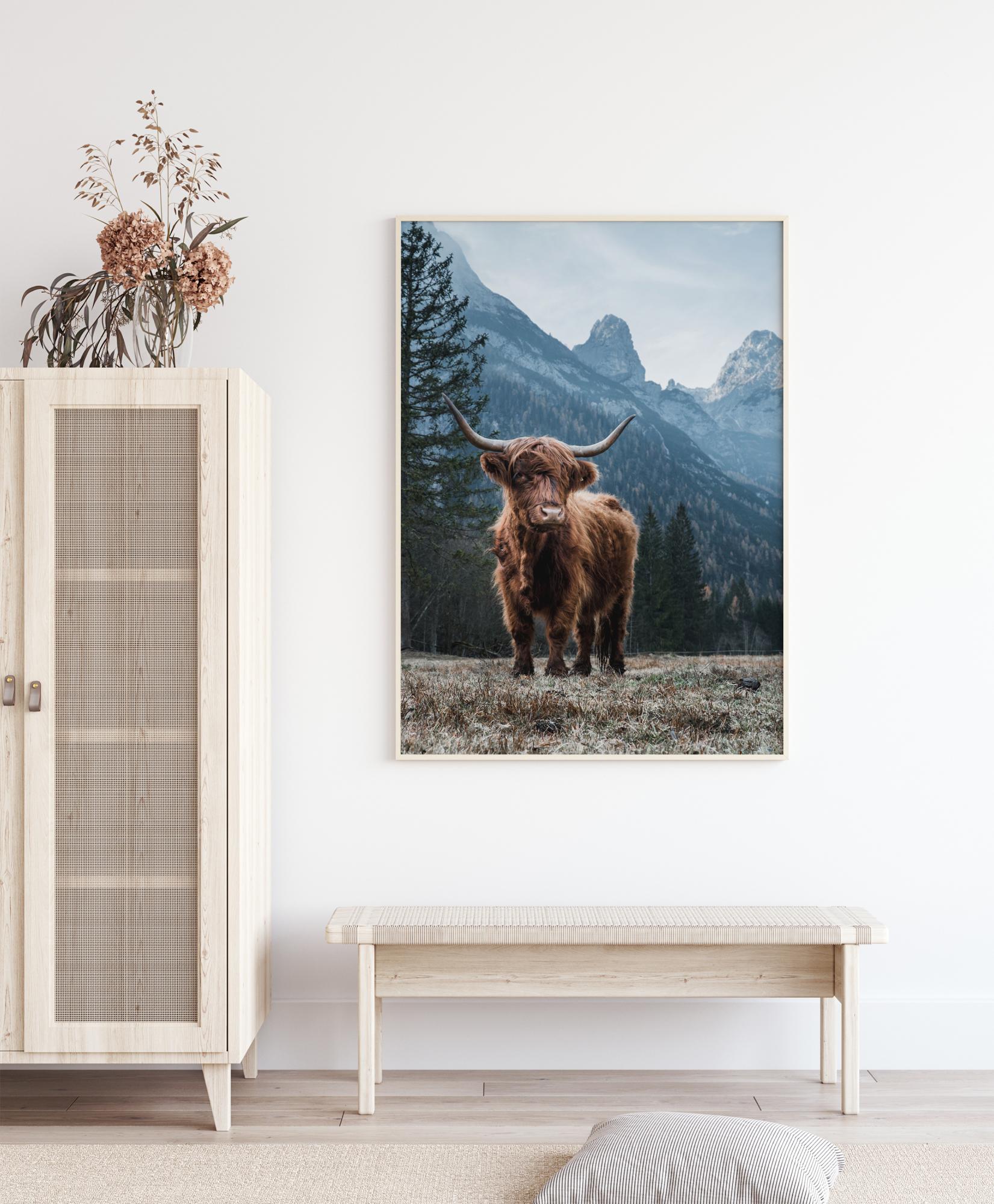 Affiche sauvage d'une vache écossaise rousse se tenant seule dans un champ. Les montagnes escarpées couvertes de neige entourent ce bel animal. Avec son pelage court et hirsute qui lui permet de résister à des conditions extrêmes, rien ne semble le gêner. Faites appel à votre imagination et voyagez au cœur des Highlands écossaises.