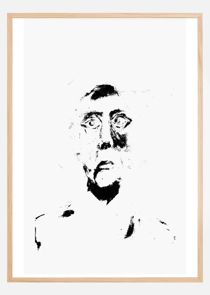 Un étrange portrait noir et blanc de la tête et des épaules d’un homme. Sur un fond blanc, les nuances sombres mettent en valeur les cheveux, les joues et le cou du personnage. Les grands yeux du protagoniste expriment la peur et le mystère. Une image triste et sinistre qui fout les jetons.