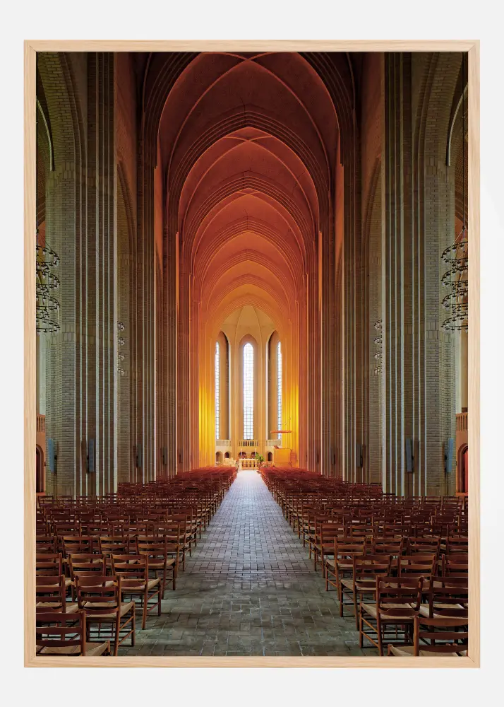 Une affiche architecturale à couper le souffle à l'intérieur d'une église. La longue allée menant à l'autel et le haut plafond et les colonnes de pierre donnent un sentiment de paix. La lumière orange vif qui se reflète à travers les fenêtres procure un sentiment de chaleur et d'harmonie. Ressentez la paix et la tranquillité grâce à cette impression.