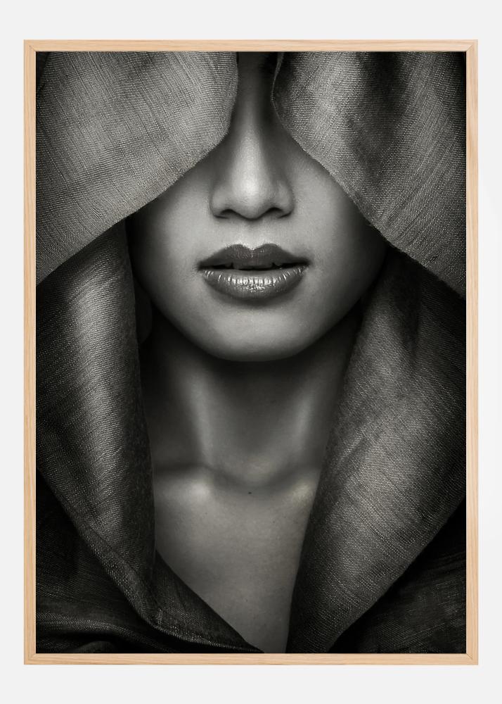 L'image dépeint un gros plan puissant et captivant d'une personne drapée dans un tissu, avec un focus sur les lèvres marquées et la ligne de mâchoire forte. La texturation détaillée du tissu et les ombres douces sur la peau ajoutent une profondeur et une complexité qui attirent le spectateur dans le sujet. La palette monochrome met en valeur chaque détail et crée une sensation intemporelle.