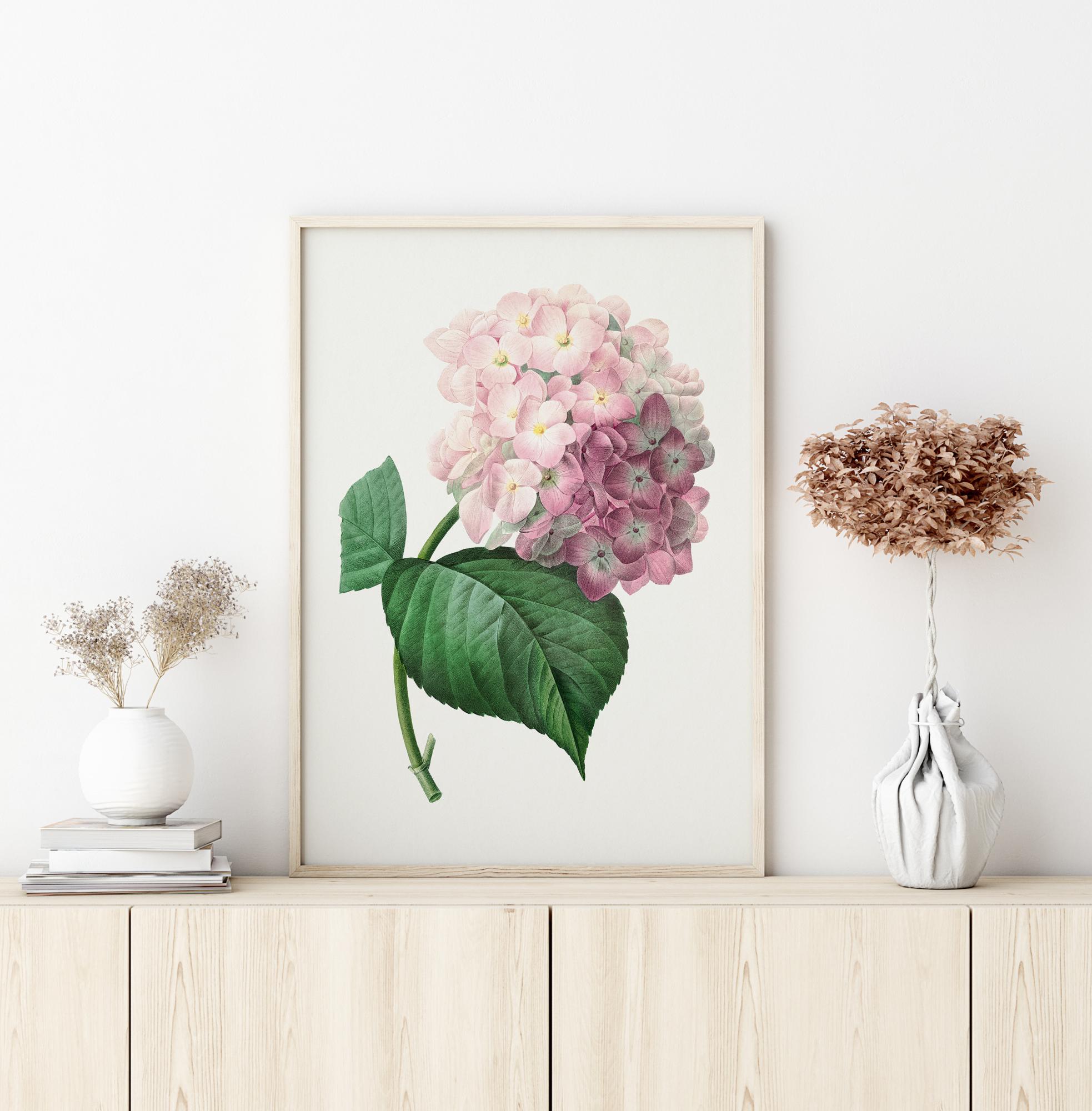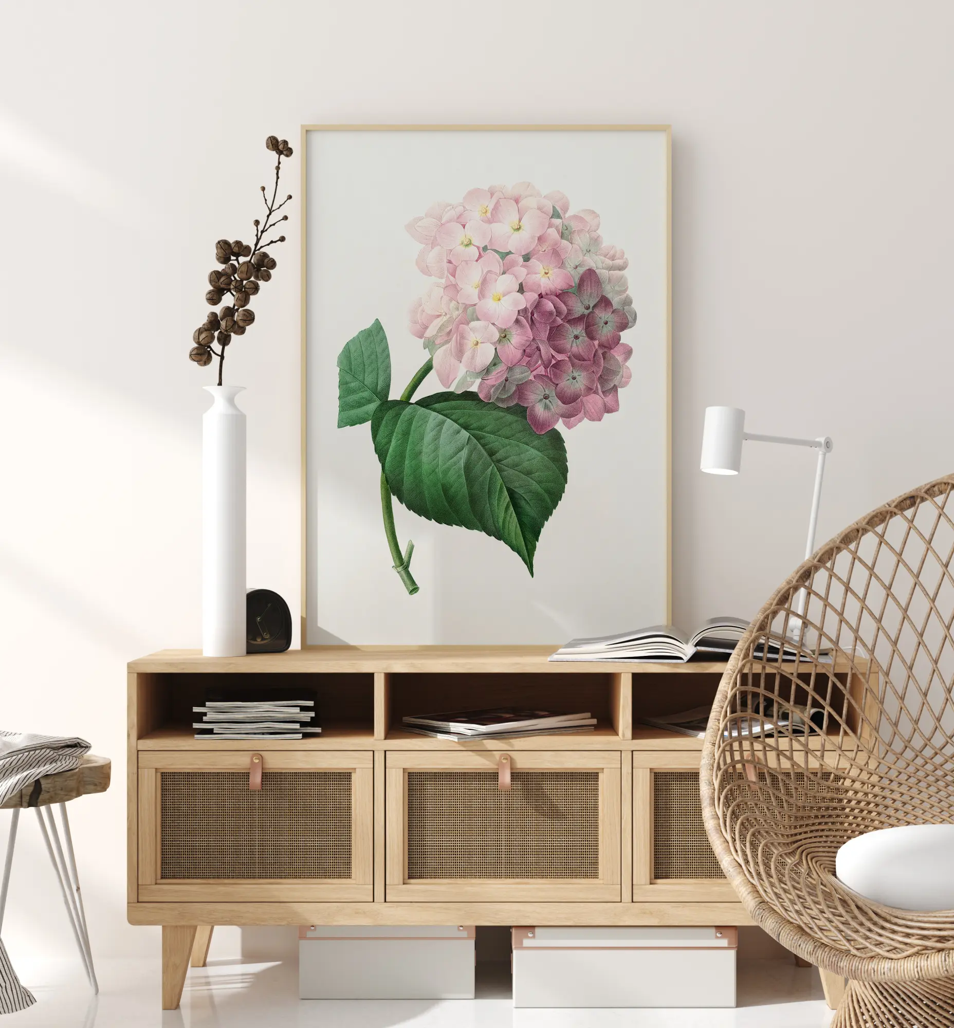 Une affiche florale d'un hortensia. Des pétales rose tendre avec une tige verte lisse et une feuille verte dominent le centre de l'image. Sur un fond blanc immaculé, cette fleur belle et délicate évoque un sentiment de tranquillité. Accrochée dans votre jardin d'hiver, elle ajoute un touche de classe à votre environnement.