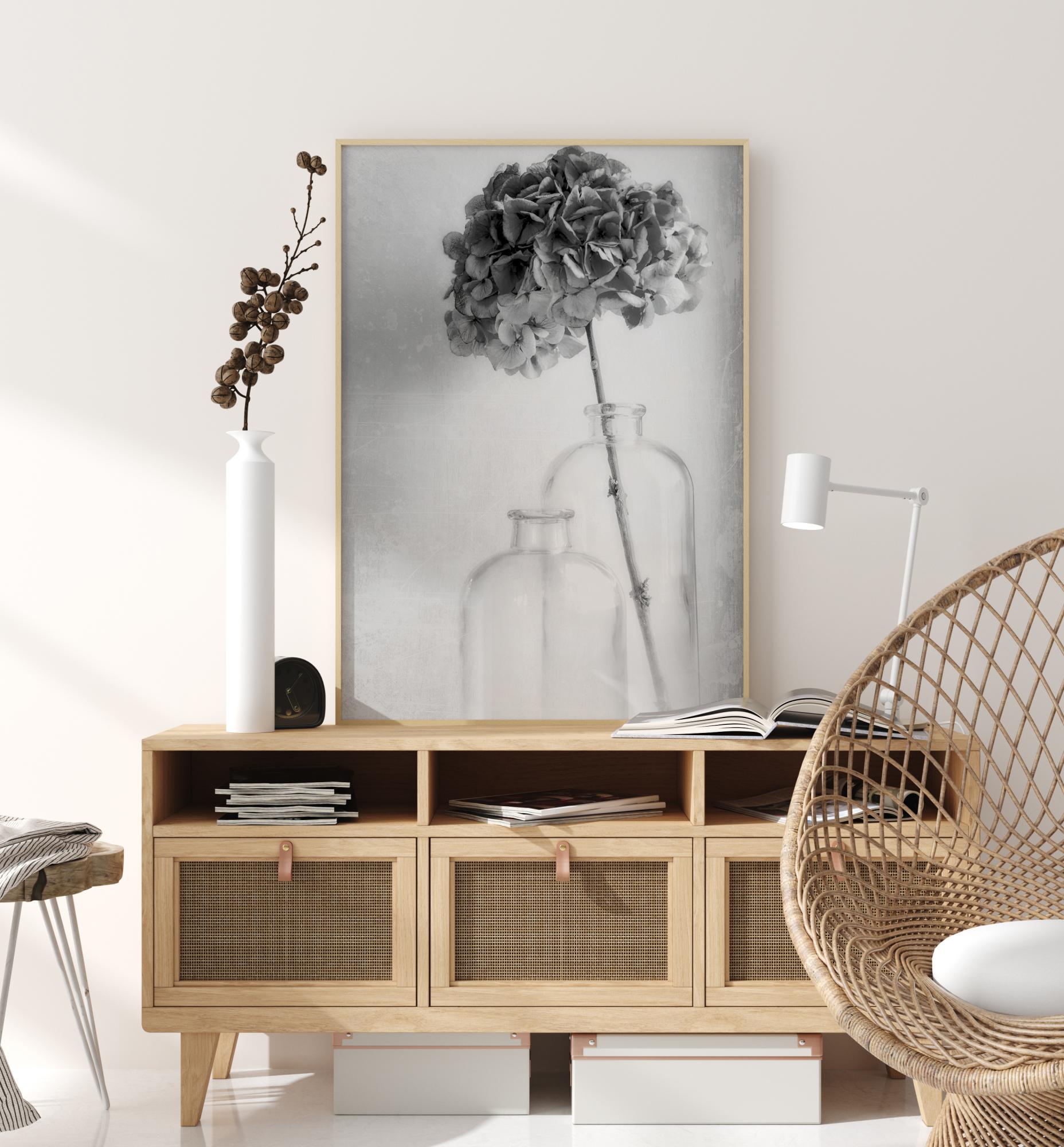Une jolie affiche nature d'un hortensia dans un vase transparent. Placé devant un rideau blanc fleuri, un délicat pétale rose tombe. Un vent doux souffle sur le rideau. Sentez la brise fraîche de cette image.