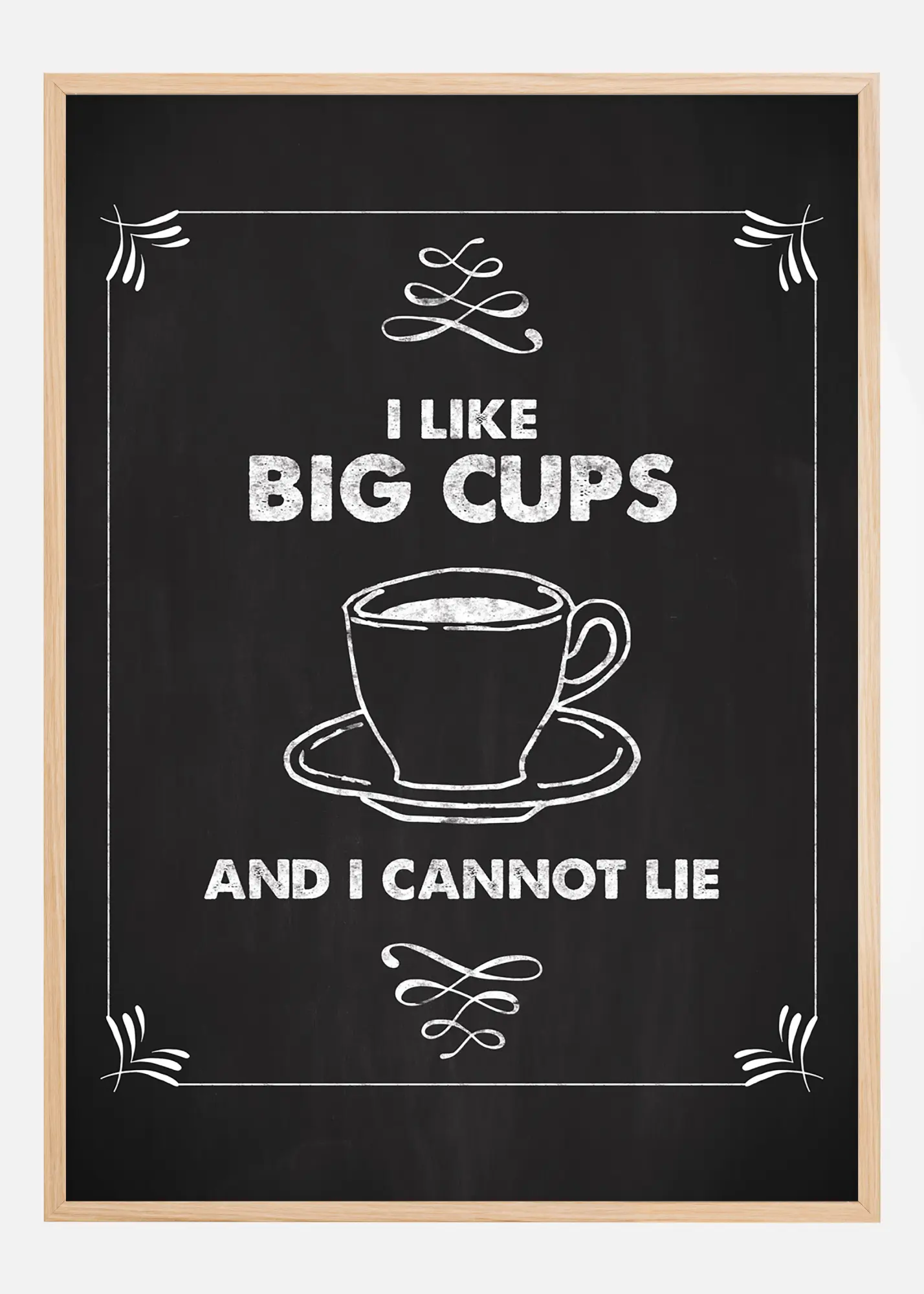 Print astucieux avec le message - J'aime les grandes tasses, et je ne peux pas mentir, pour ceux qui aiment les grandes tasses de café ou de thé. Le poster en noir et blanc, avec la sensation d'un tableau noir, se marie bien sur une étagère de tableau dans la cuisine avec des livres de cuisine et des accessoires de cuisine. Ou pourquoi ne pas le suspendre avec d'autres prints graphiques sur un mur de tableaux avec un thème du monde de la cuisine. Complétez le poster avec un cadre noir simple qui laisse parler le texte et qui renforce l'impression d'un tableau d'école.