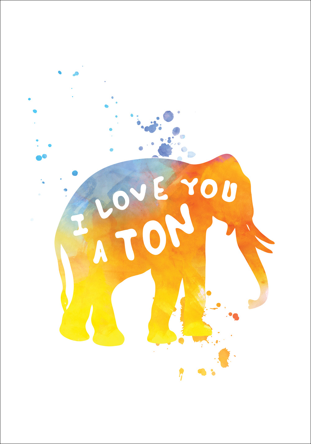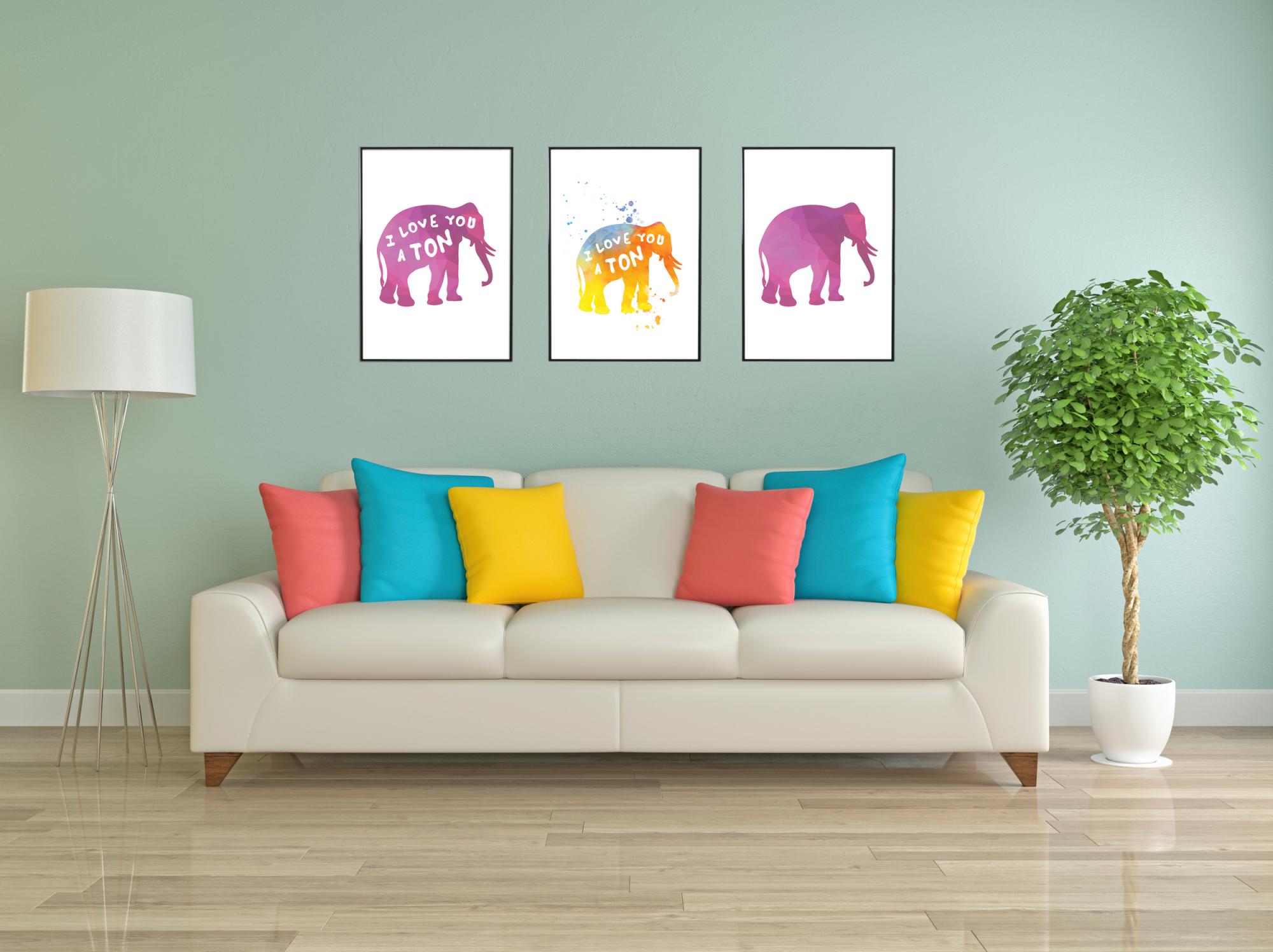 Affiche aimante et amusante, parfaite à offrir à celui qui adore les éléphants et souhaite ajouter une touche de couleur sur son mur. L'éléphant semble être imprimé avec une abondance de couleurs sur du papier blanc, avec le texte en typographie blanche donnant une impression manuscrite. Le poster est beau à encadrer avec un cadre sobre uni qui met en valeur les nuances du motif et qui s'harmonise bien avec le reste de la décoration de la pièce où le tableau sera accroché.